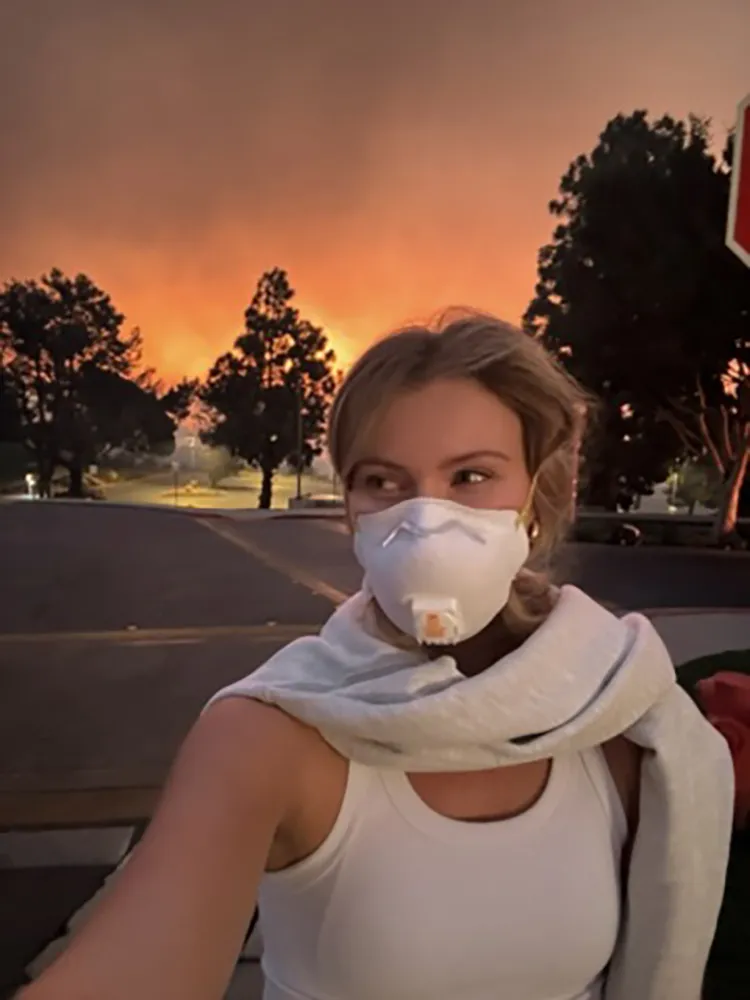 佩珀代因大学的高年级学生瑞秋·弗林在富兰克林火灾期间佩戴防护口罩。来源:瑞秋·弗林佩珀代因大学在早上7:30左右解除避难令,但取消了原定于周二的课程和期末考试。弗林在日出时分走到外面。她在学校的新闻网站和她个人的Instagram页面上发布了视频和照片。