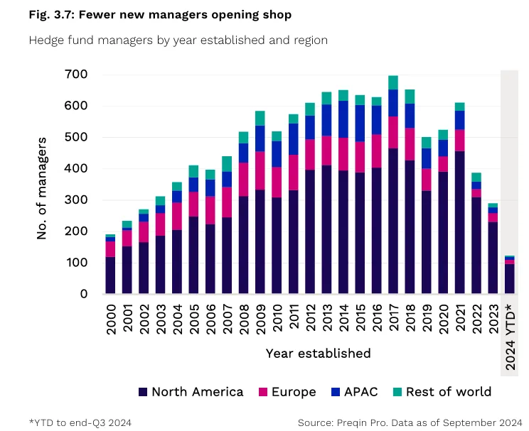 尽管在第三季度资金流入有所回升,但新成立基金数量的减少和绩效费用的下降表明了这一挑战的明显性。根据数据提供商 Preqin 的最新报告,截至九月,今年共有123家公司开业——预计将是自2000年以来新进入者数量最少的一年。与此同时,尽管整个行业的管理费用有所上升,但同期的绩效补偿却是自2010年以来的最大跌幅。