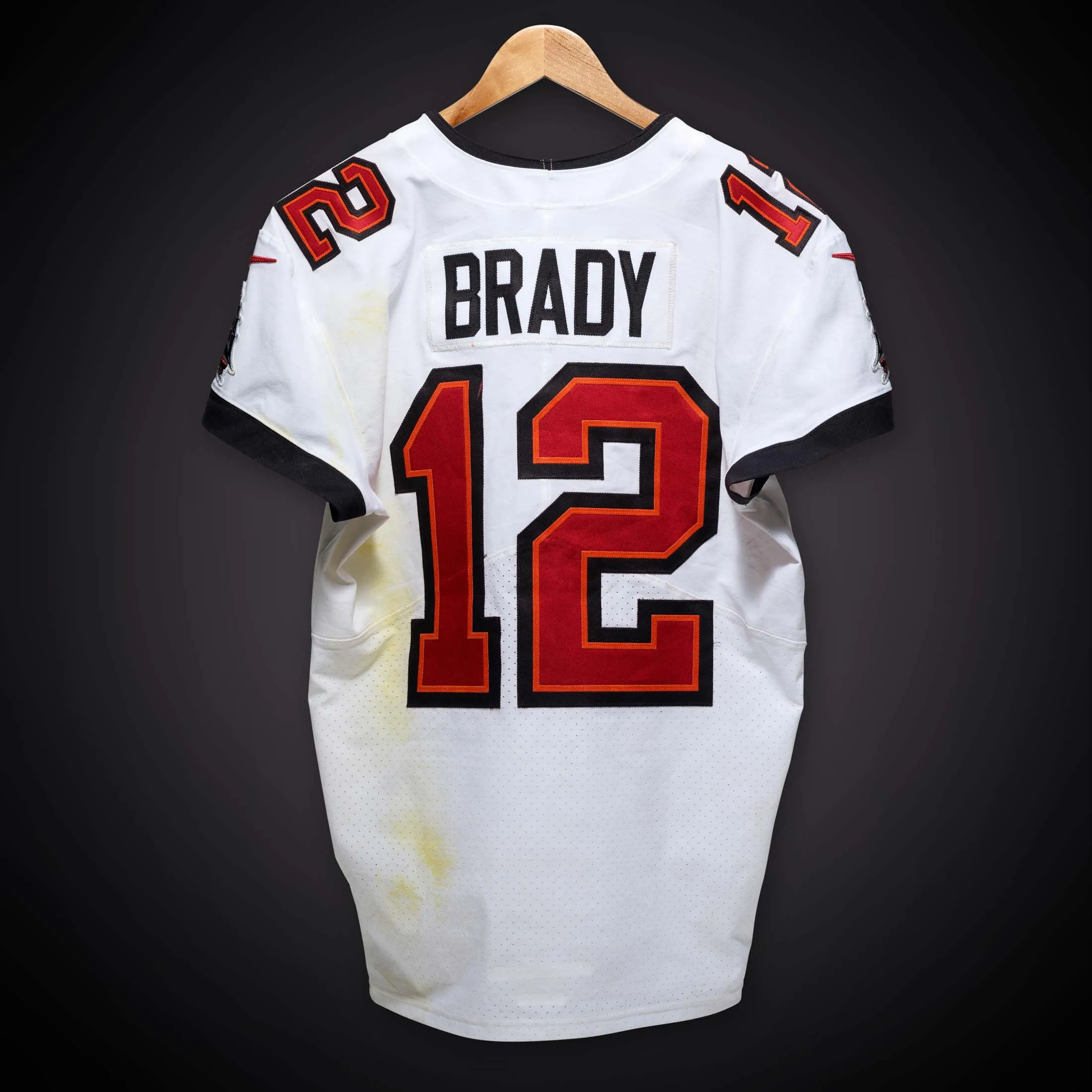 布雷迪在打破历史传球码数记录时穿的坦帕湾海盗队客场球衣以504,000美元售出。来源:苏富比### 更多来自彭博社