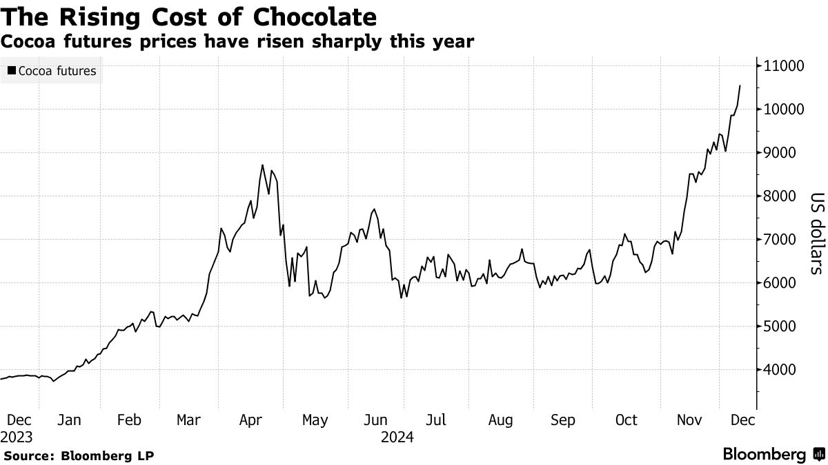 当时,纽约的可可期货已经降温,但由于对西非(最大的种植区域)恶劣天气和较低产量的担忧,价格已经上涨超过50%。这可能意味着巧克力公司面临更多痛苦,因为它们正在重建可可对冲并补充库存。