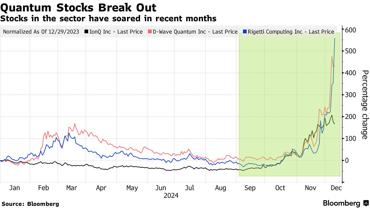 虽然AI今年一直是科技投资者的核心关注点,但量子计算股票最近也获得了一些巨大的收益。IonQ Inc.自9月低点以来上涨了约400%,而D-Wave Quantum Inc.上涨了近500%,Rigetti Computing Inc.则飙升了超过840%。这个主题在周二引起了关注,因为Alphabet Inc.的分析师赞扬谷歌母公司通过使用其Willow芯片在量子计算方面的重大进展。