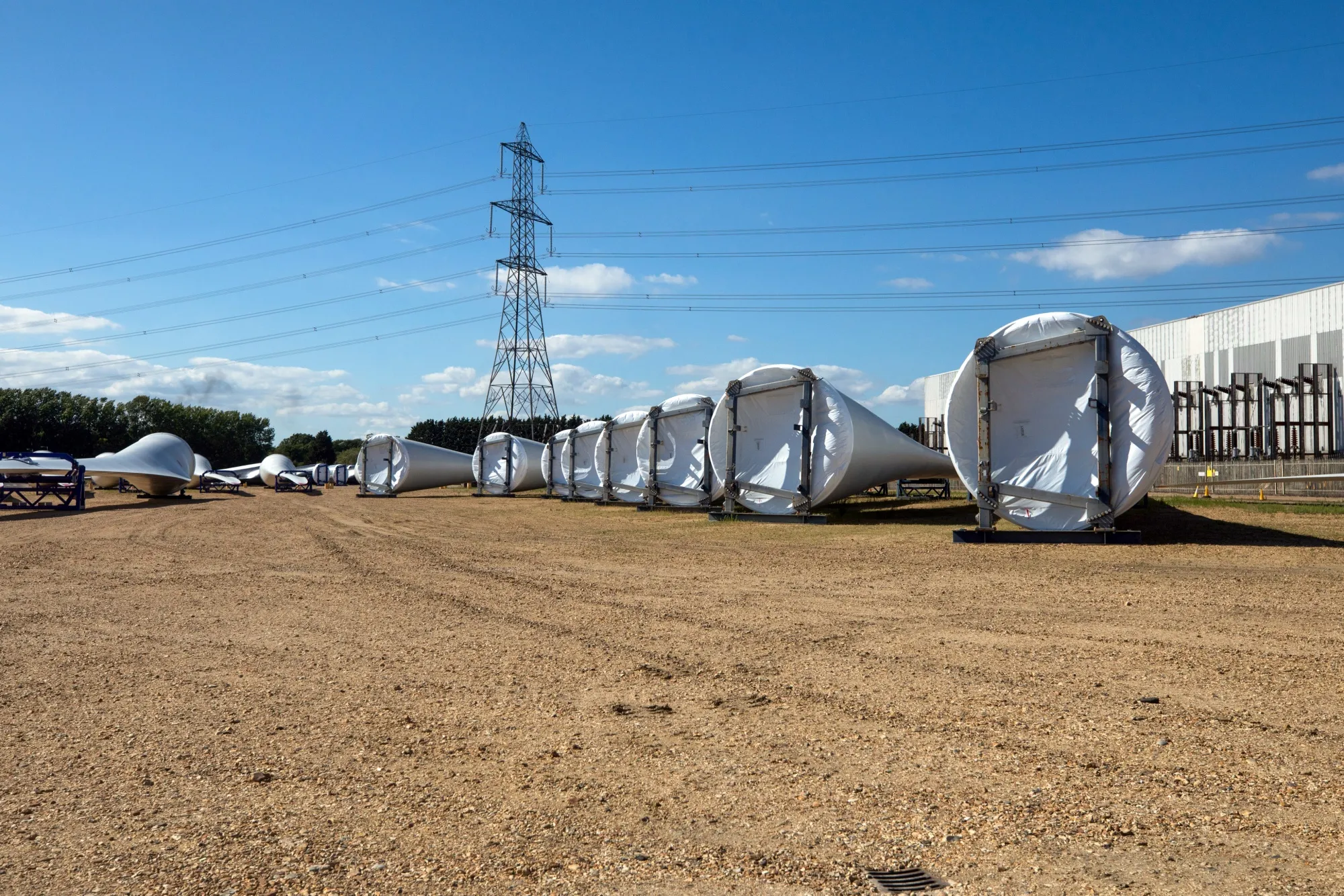 在英国福利的电力塔下,由维斯塔斯风能制造的风力涡轮机叶片。
