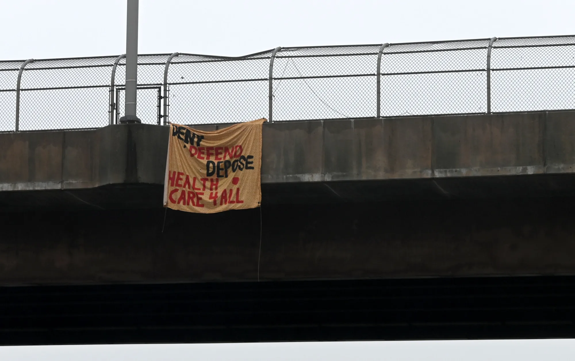 在马里兰州I-83的一座天桥上悬挂着一条横幅,上面写着:“拒绝辩护,推翻全民医疗。”摄影师:劳埃德·福克斯/巴尔的摩太阳报/盖蒂图片社但在这起杀戮事件之后,愤怒的程度甚至让行业老兵感到惊讶。