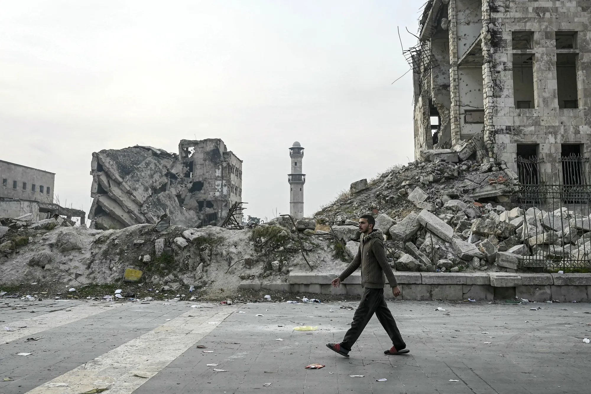 一名男子在叙利亚阿勒颇城堡的受损建筑废墟旁走过,时间是12月11日。