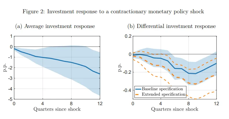 “**我们实证分析的主要结果是,如果企业在冲击时有更大比例的债务到期,那么企业的投资对货币政策的反应会更强。**这一结果在统计上和经济上都具有重要意义。**在一次典型的紧缩货币政策冲击后,具有一个标准差更高到期债券比例的企业,其资本存量会经历持续的额外减少,峰值在冲击后八个季度达到0.2%。假设年投资与资本比率为10%,这对应于投资减少1%。**更高的到期债券比例还与信贷利差、债务、销售和就业的放大反应相关。这些结果在控制企业之间的永久性差异以及各种时间变化的企业特征(如规模、年龄、杠杆和流动性)时依然稳健。”