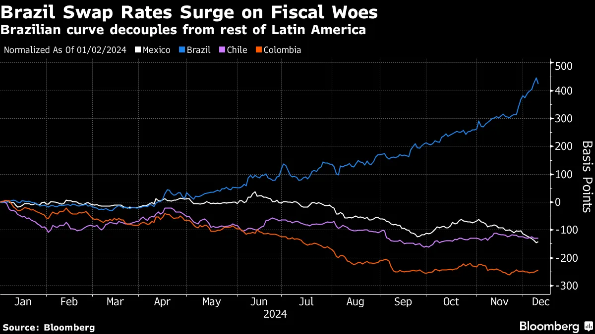 然而,在过去几个月中,所看到的是一个抛售的无情过程。巴西的收益率曲线与其同行完全脱节,2026年1月到期的合约在一年内上涨超过470个基点。墨西哥和智利的类似合约在同一时期则下跌。