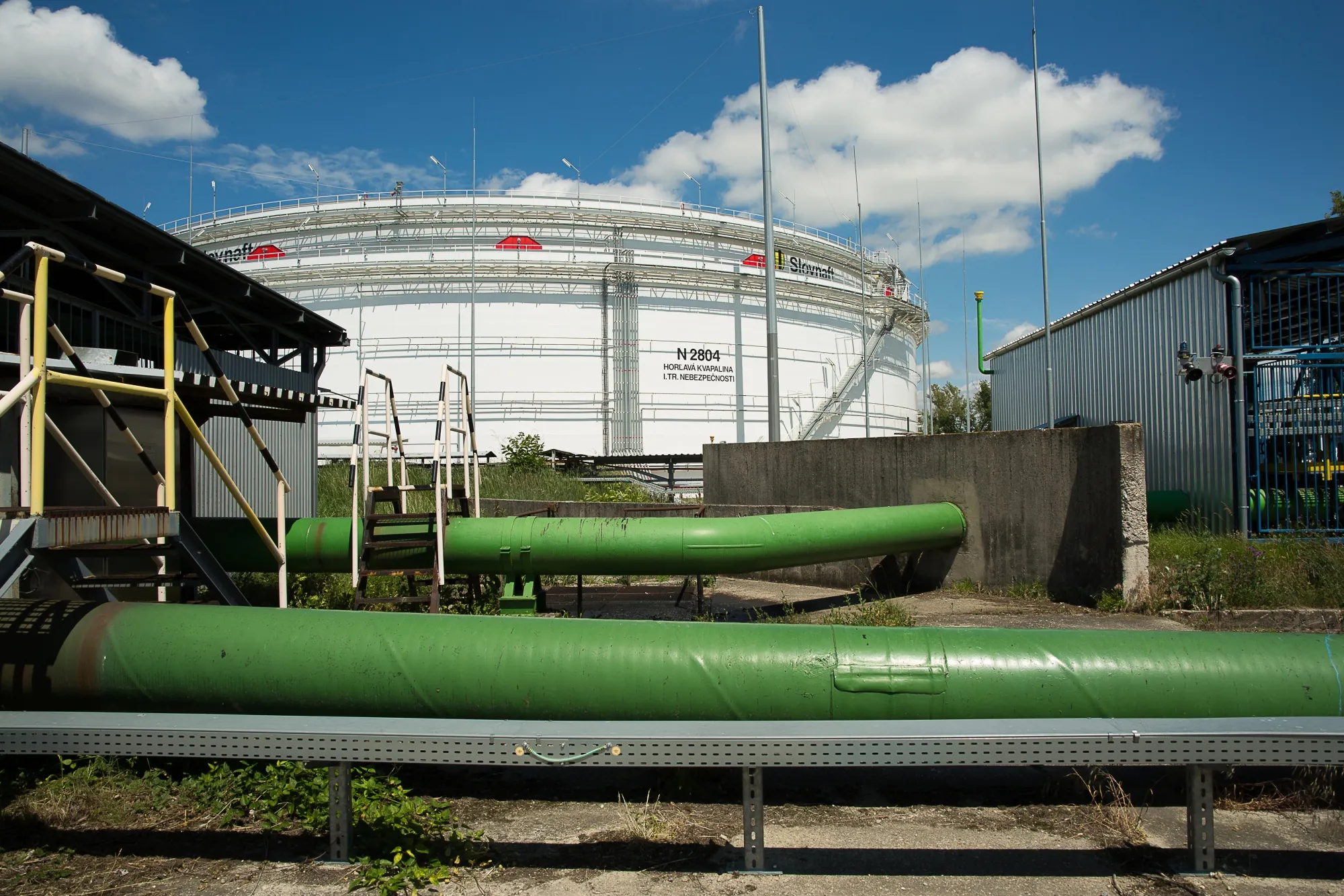 斯洛伐克布拉迪斯拉发的Mol-Slofnaft炼油厂的一个石油储存罐。