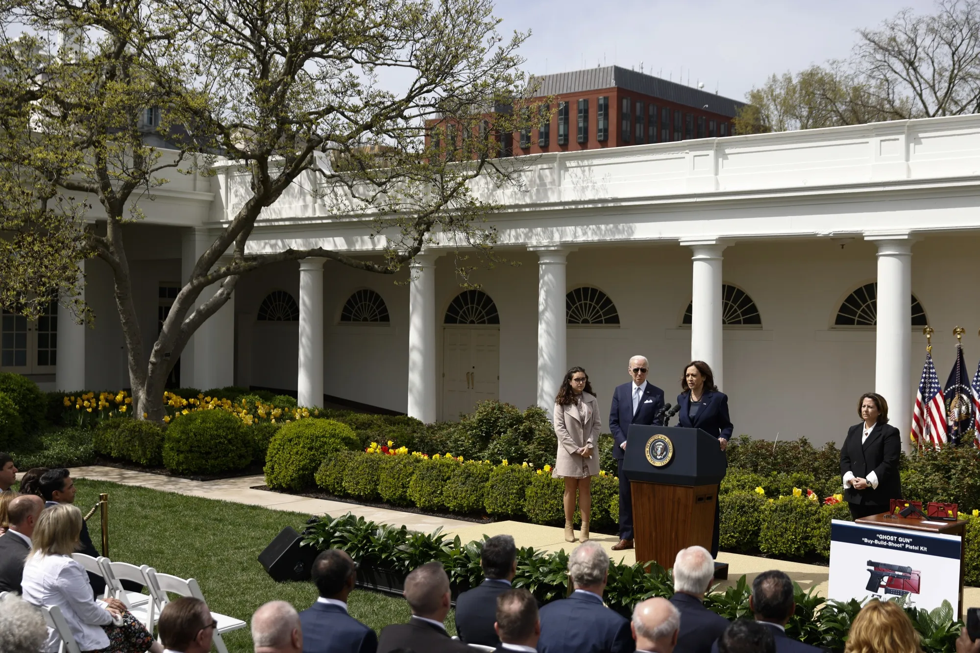 卡马拉·哈里斯和乔·拜登于2022年4月11日在白宫玫瑰园发表讲话。摄影师:丁申/彭博社### 幽灵枪的法规是如何受到挑战的?