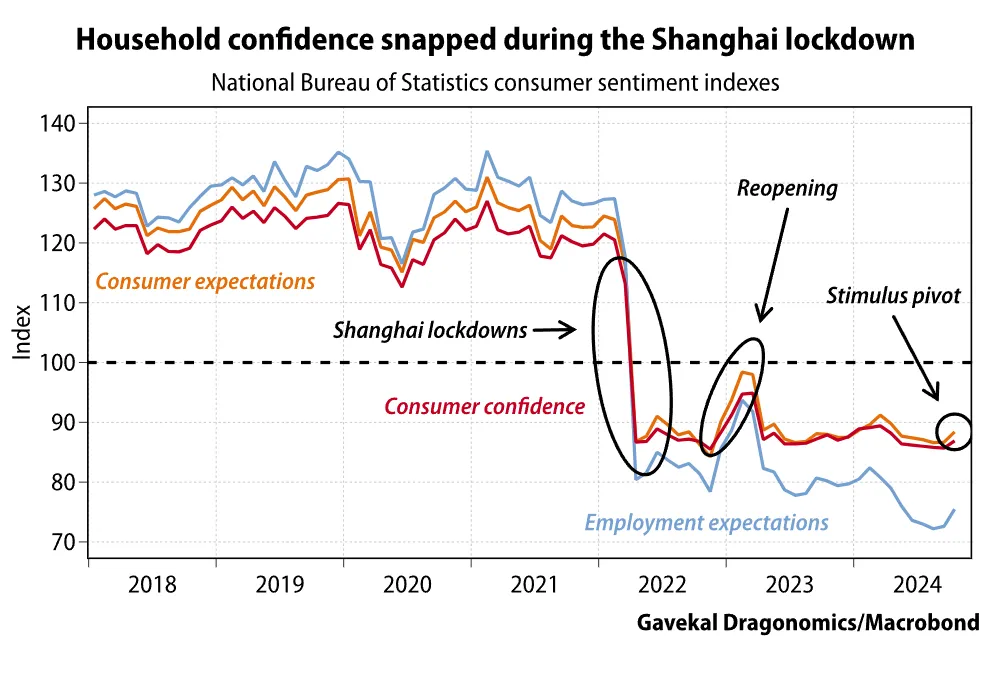到目前为止,中国的回应是再次提振经济。周一,政治局承诺采取“非凡的逆周期”政策和“适度宽松”的货币政策。彭博经济学的常舒认为,政府可以停止逐步注入刺激,并更有力地使用其政策杠杆:“对标志性改革的承诺提高了政府将面对更多限制经济的根本挑战的希望,这可能在中期内促进增长。”高盛研究的克里斯托弗·贝多尔认为,这些信号的影响虽然显著,但微不足道,如下图所示,跟踪消费者信心: