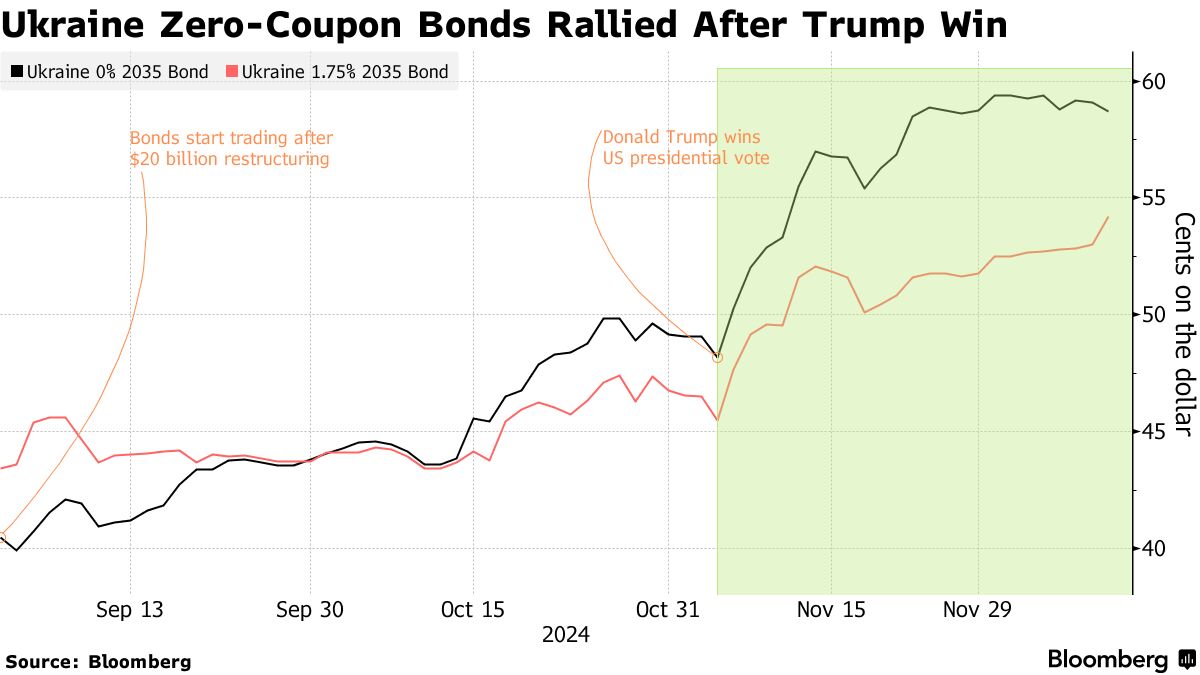 自唐纳德·特朗普赢得白宫竞选以来,各类乌克兰证券持续在新兴市场排名中领先。这些收益是由于对停火的押注,认为在他接任美国总统后,针对俄罗斯入侵的战争可能会更接近停火。