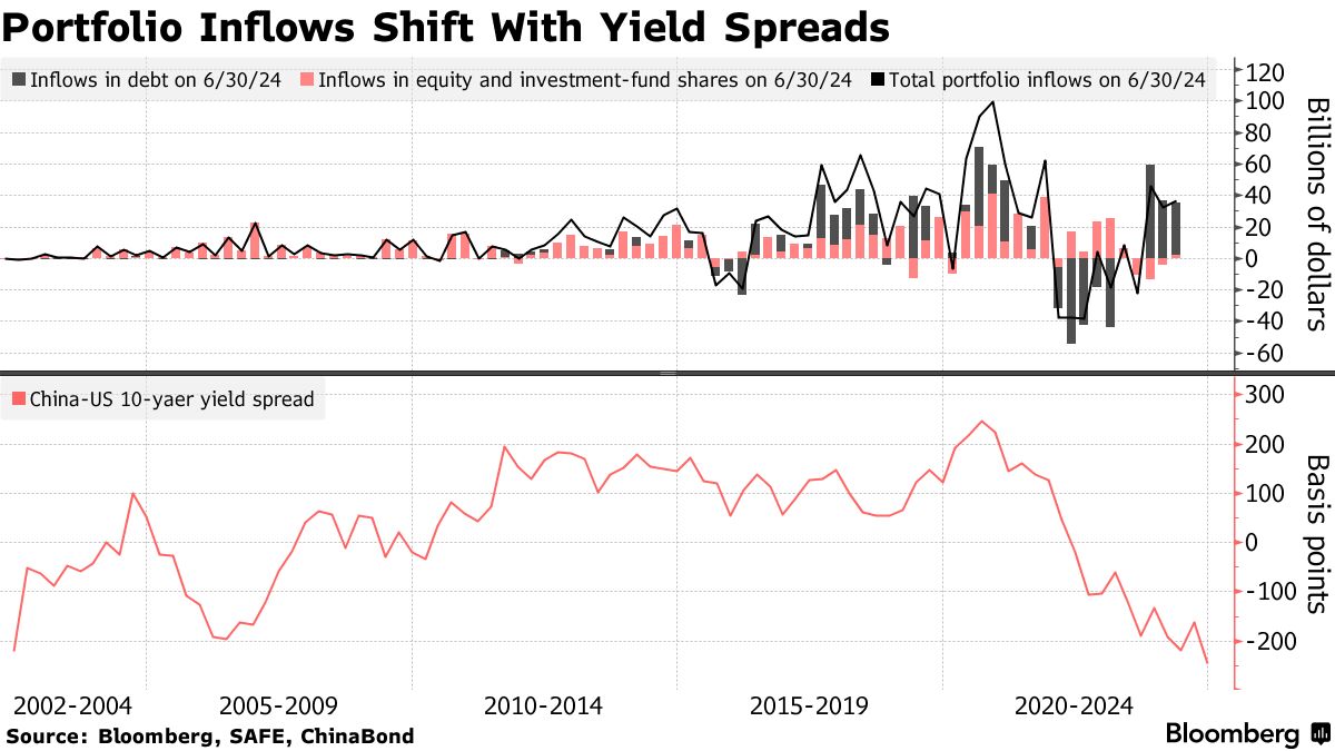 中国10年期国债收益率已下降至比类似美国债券低245个基点。这发生在中国收益率本周跌至新低,此前共产党最高决策机构承诺在2025年实施“适度宽松”的货币政策,这是其 近14年来的首次政策转向。