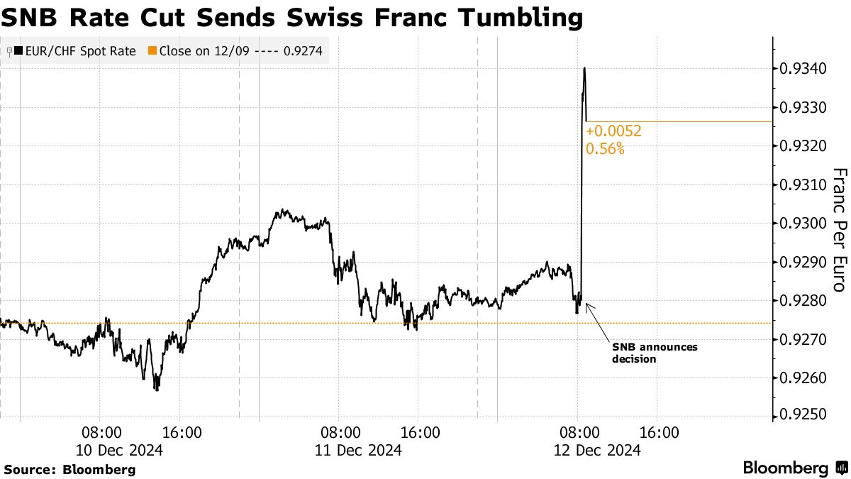 瑞士法郎(CHF)在瑞士国家银行降息半个百分点后跌至两周低点 - 彭博社