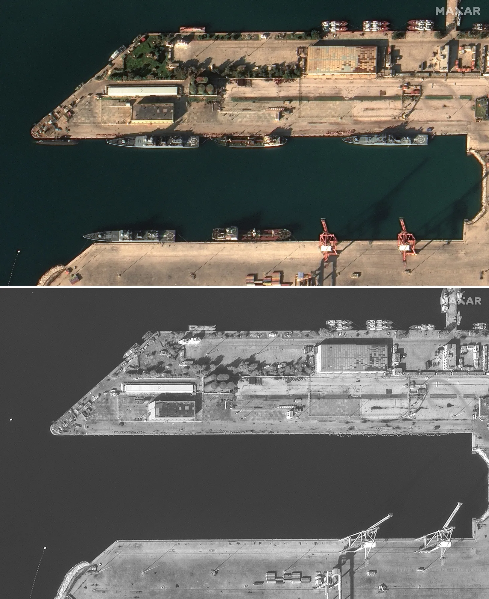 2024年12月5日,叙利亚塔尔图斯的俄罗斯海军基地,顶部,以及12月10日。来源:卫星图像 ©2024 Maxar Technologies克里姆林宫在周末将阿萨德及其家人飞往俄罗斯流亡,经过说服这位叙利亚独裁者相信他已经在与逼近首都大马士革的叛军的战争中失败。