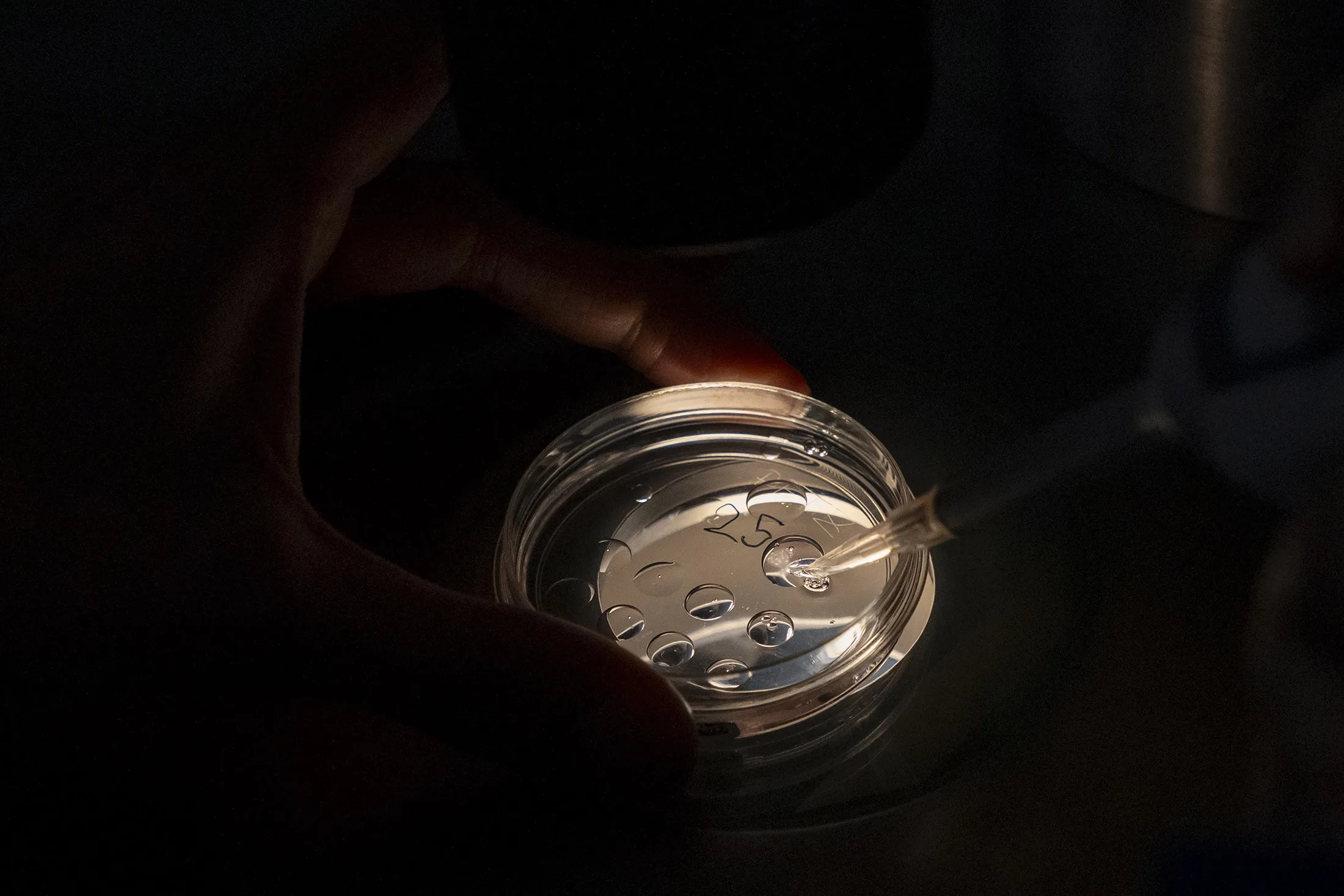 最近收获的卵子在布宜诺斯艾利斯的WeFIV诊所进行检查。
