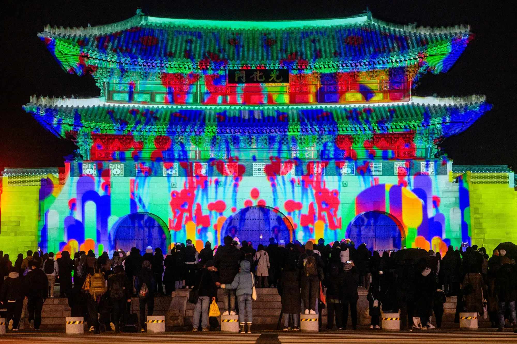 2013年首尔冬季节庆期间,光化门的灯光秀。摄影师:安东尼·华莱士/法新社/盖蒂图片社由于未遂的戒严法令影响了人们的节日气氛,一些地方节日的规模已缩小。文化部长表示,他正在请求组织者按计划进行节日活动,以便经济保持运转,人们从这些活动中获得安慰。