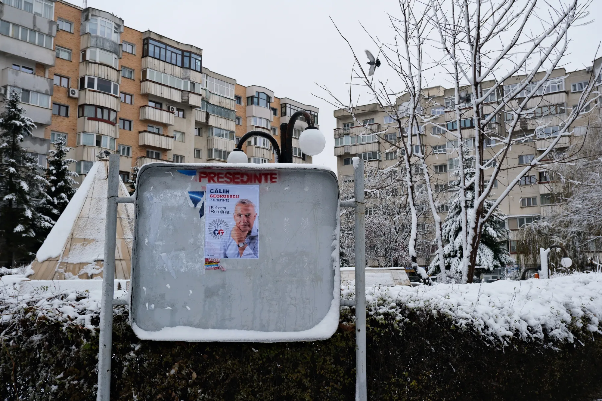 2024年12月10日在罗马尼亚北部苏恰瓦为乔治斯库制作的竞选海报。摄影师:马克西姆·爱德华兹/彭博社 感谢您阅读我们的通讯。请将任何反馈发送至 [email protected]*。*