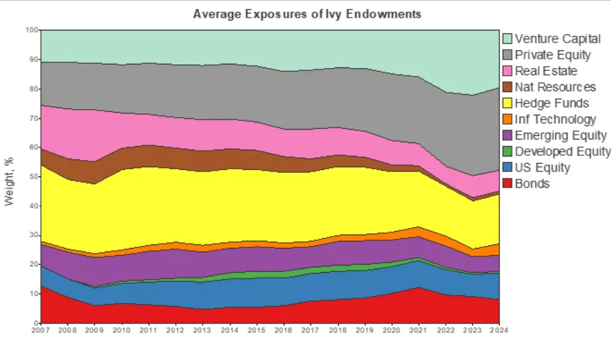 捐赠基金在理论上拥有无限的时间视野,独特地处于有利位置。管理耶鲁模型的首席投资官更倾向于分配到私募市场,以获取流动性溢价,以及公共市场无法提供的回报机会。根据他们基于回报的模型估算,而非实际报告的配置,常春藤对股票的主要投资来自私募市场,分为更传统的私募股权(收购)和风险投资(或增长私募股权)。自全球金融危机以来,私募股权往往挤压对冲基金,但美国股票和债券的总和已降至20%以下。