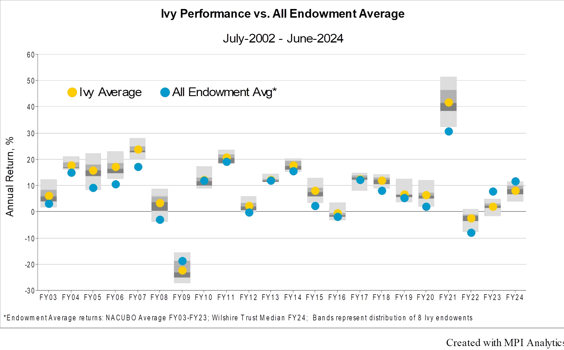 尽管从去年的低迷表现中恢复过来,常春藤盟校仍然连续第二年落后于平均捐赠基金——这是二十多年来首次发生这种情况。这个MPI图表突出了最近的表现不佳: