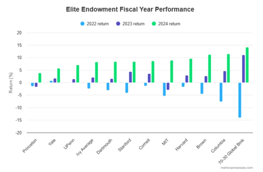 捐赠基金的表现取决于其资产配置,这一决策源于风险承受能力水平。2024年的报告季显示了他们的表现。Markov Processes International或MPI,跟踪常春藤联盟捐赠基金的表现,揭示了一个有趣的趋势。连续第二年,常春藤的表现落后于一个简单的70/30基准(70%股票,30%债券)。这引发了关于已故捐赠基金经理大卫·斯文森所提出的著名耶鲁模型的新问题,该模型通过进入一系列非流动性和私有市场而彻底改变了投资:
