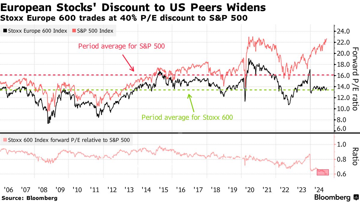 这些趋势进一步扩大了欧洲与美国在未来市盈率倍数上的折扣,较去年的水平推高至约40%的历史新高。