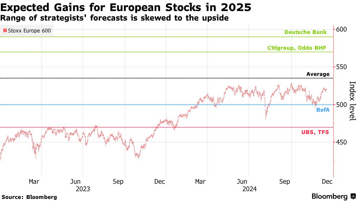 根据彭博社对20位策略师的调查,Stoxx欧洲600指数将在2025年结束时达到535点,这表明与周三的收盘相比,涨幅不足3%。与此相比,S&P 500指数的预测平均上涨7.5%,在最乐观的情况下甚至可达17%。