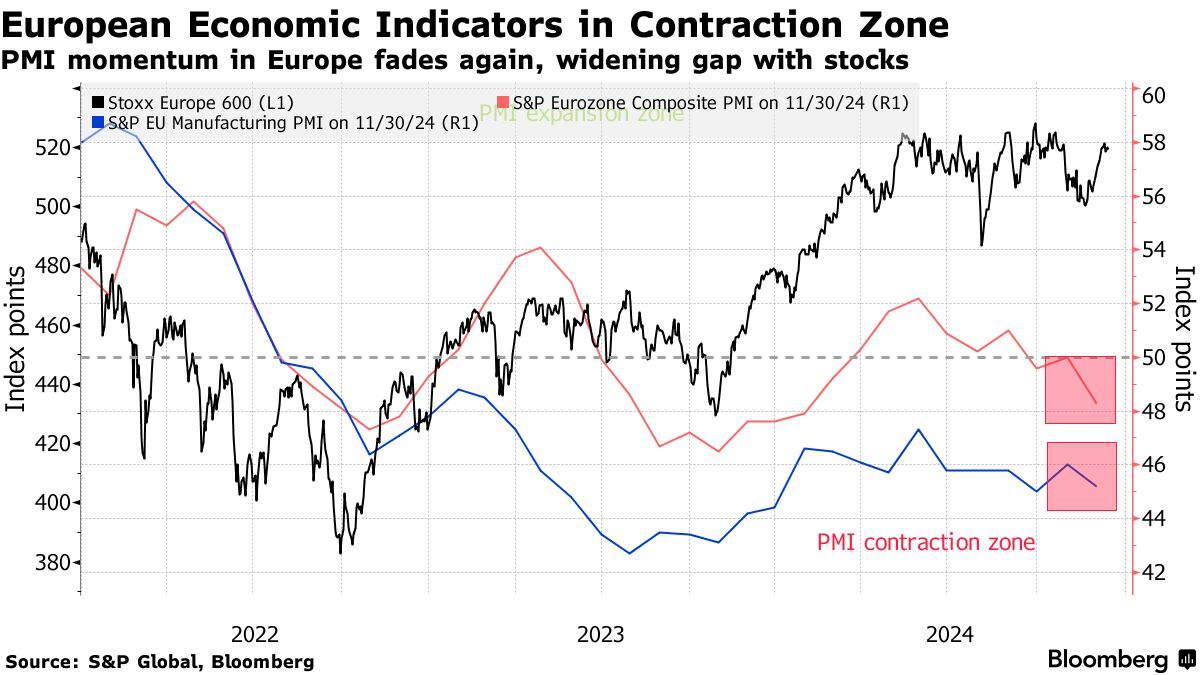 尽管Stoxx 600今年上涨超过8%,但它仍然面临着与S&P 500的历史最低年表现之一。法国和德国的政治动荡以及缓慢的经济增长使得欧洲股票难以跟上美国股票的步伐,而后者则受到强劲经济的支撑。同时,唐纳德·特朗普潜在的贸易关税也成为欧洲的额外逆风。