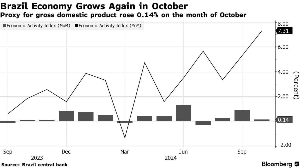 拉丁美洲最大的经济体又一个超出预期的增长年即将结束,大多数分析师预计2024年国内生产总值将增长超过3%。家庭在创纪录的低失业率和更高的政府支出下增加消费,尽管国内需求的强劲也导致通货膨胀预期飙升。
