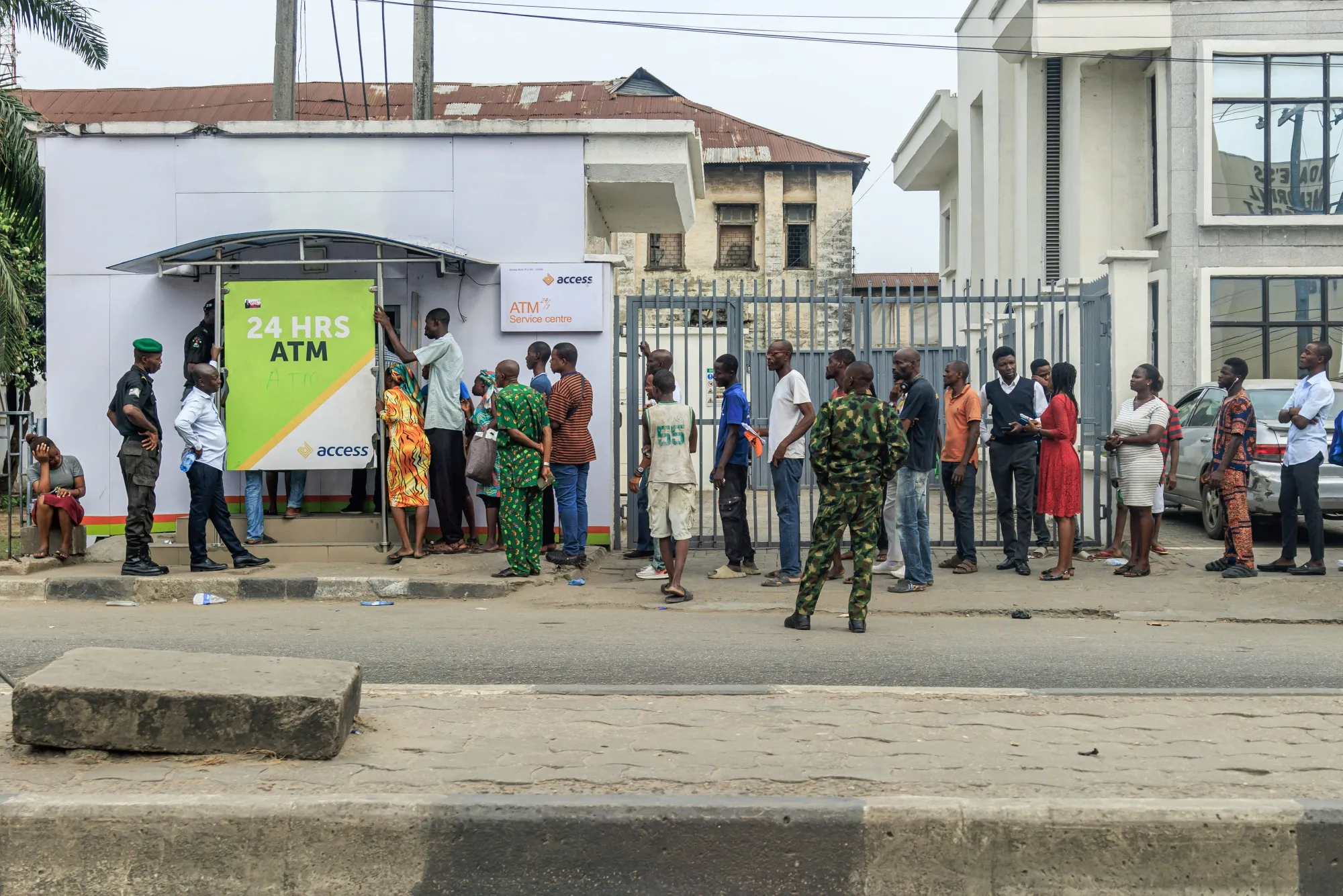 顾客在尼日利亚拉各斯的一家Access Bank分行外排队提取资金。摄影师:本森·伊比阿布奇/彭博社 即将到来