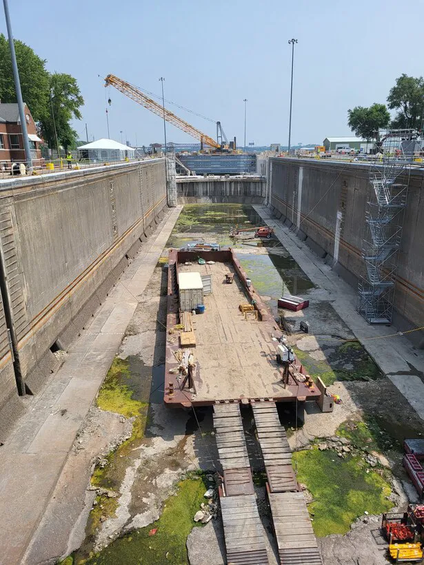 布兰登路闸室内部,最近施工期间排干。照片:美国陆军工兵团这些措施的有效性是一个有争议的话题。没有鲤鱼被记录通过这些障碍。但在障碍上游,靠近密歇根湖,发现了一小部分鲤鱼和大量它们的DNA。在2009年一次DNA发现后,密歇根州起诉工兵团和伊利诺伊州,要求关闭运河,因为鲤鱼对五大湖渔业的威胁。这样的关闭将阻止使用运河进出密歇根湖的小型驳船交通,并迫使芝加哥重新考虑其废水处理。关于关闭的成本争论不休:工兵团估计为180亿美元;倡导团体则认为接近20亿美元。