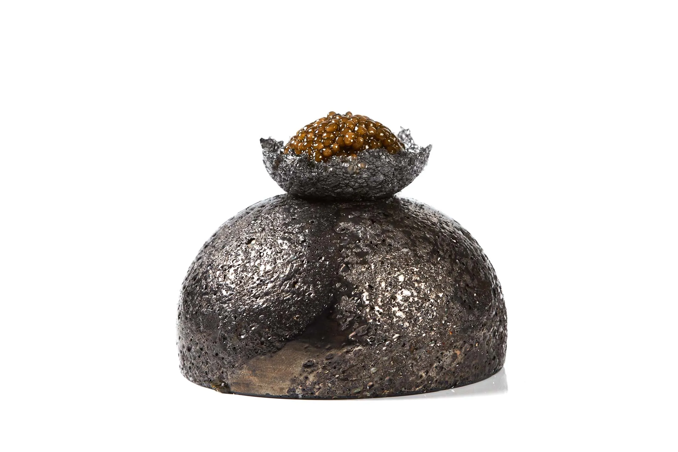 炼金术士的惊人太空面包。来源:炼金术士,哥本哈根太空面包,炼金术士明年在海王星飞船上用餐需要495,000美元,当丹麦厨师拉斯穆斯·蒙克在平流层为六位食客烹饪时,我不会是其中之一。但在我访问他奇幻的炼金术士餐厅时,我品尝到了他计划提供的一道菜:太空面包。它的形状更像是一个斑点黑花岗岩的清酒杯,而不是一片面包,轻得令人震惊,感觉就像可以漂浮——除了溢出的白鱼子酱填充物。由经过气化的优质陈年酱油制成,然后真空包装,这种“面包”具有丰富的焦糖味,几乎在口中蒸发,只留下鱼子酱慢慢爆发出层层咸味。蒙克开发了这种技术,以喂养那些无法吃固体食物但又想念脆感的儿童医院患者。