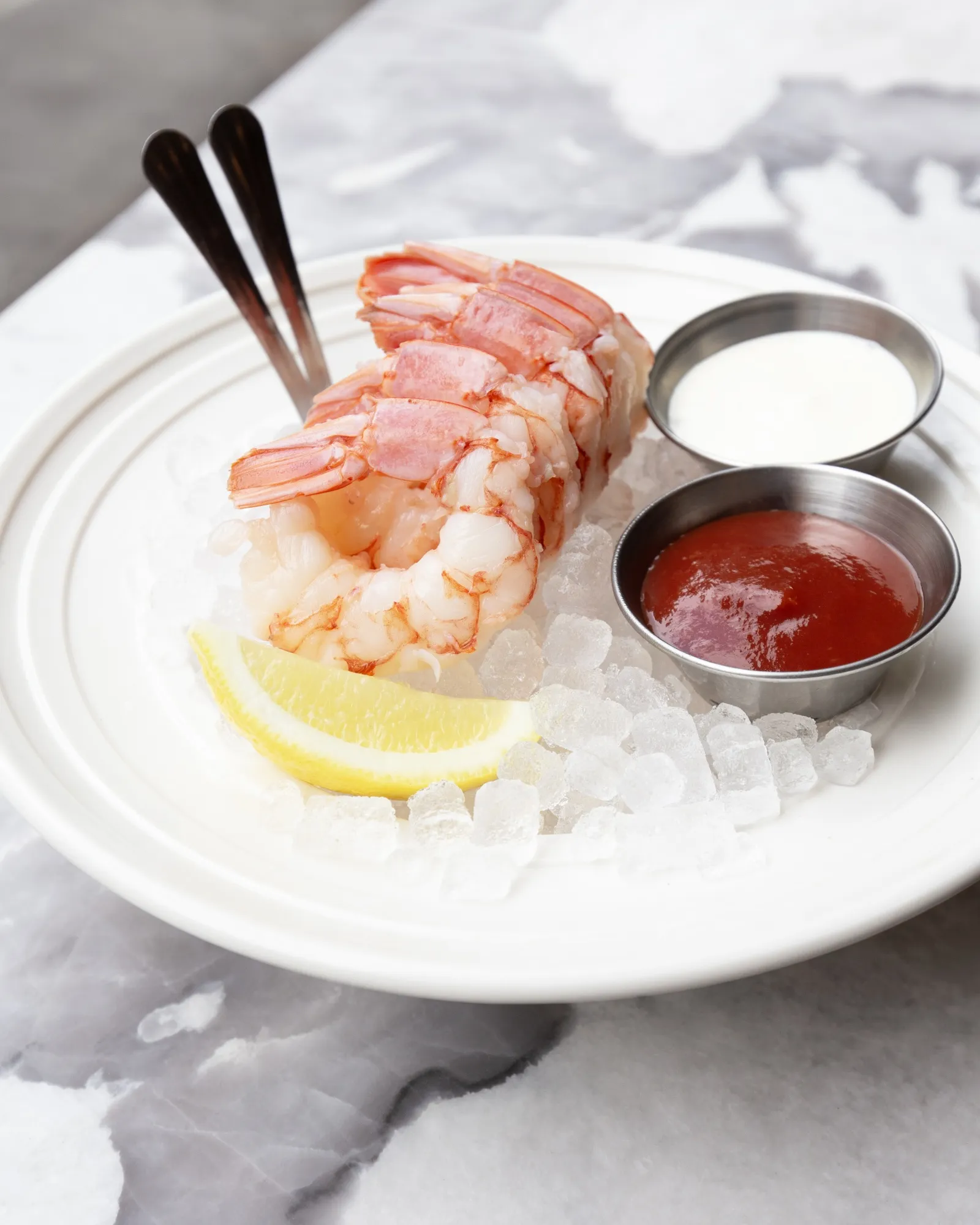 也许是有史以来最好的虾鸡尾酒,在Penny。摄影师:Karissa Ong虾鸡尾酒,Penny在这家东村的楼上餐厅的长柜台后,厨师Joshua Pinsky重新思考了海鲜餐厅的可能性。简洁的菜单上有几道主打菜,包括用浸泡在黄油中的香草涂抹的美丽烤龙虾。但请注意听起来无聊的虾鸡尾酒。传统上,虾在调味高汤中短暂烹煮,然后被放入冷水中冷却。Pinsky颠覆了这个过程:他蒸制腌制虾,然后让它们浸泡在加入鱼露和发酵米调味剂shio koji的盐水中,这样丰满的海鲜就有更长的时间吸收盐水的浓烈咸甜味。