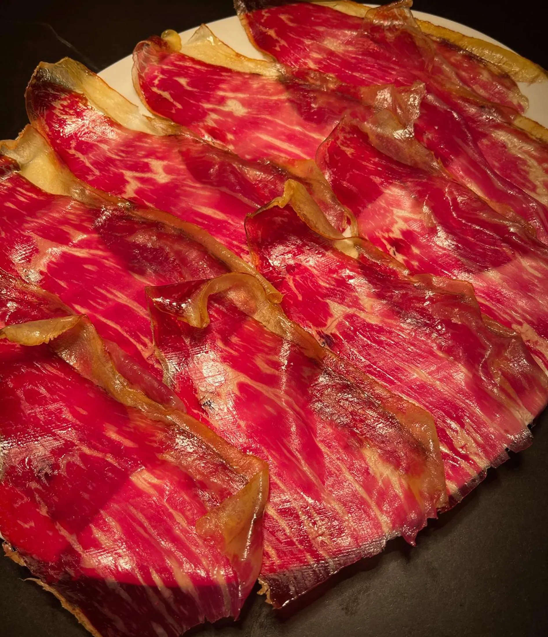 来自山脉的美味腌制乳制牛肉拼盘。来源:山脉腌制乳制牛肉,山脉厨师汤莫斯·帕里是乳牛的传播者,推广成熟、浓郁风味的牛肉,这些牛肉已经从挤奶的世界退役。他在其出色的西班牙与威尔士融合餐厅山脉的菜单上,通常会有几块在餐厅后方的火上烹饪的厚切肉。他还提供一盘腌制的、带有脂肪纹理的红粉色切片作为开胃菜。它们具有顶级腌制意大利肉的独特、几乎像奶酪的风味。“对我来说,这是腌制牛肉和意大利火腿之间的完美结合,”帕里说,我同意。肉被切成薄片,室温上桌,因此脂肪会立即在你的舌头上融化。