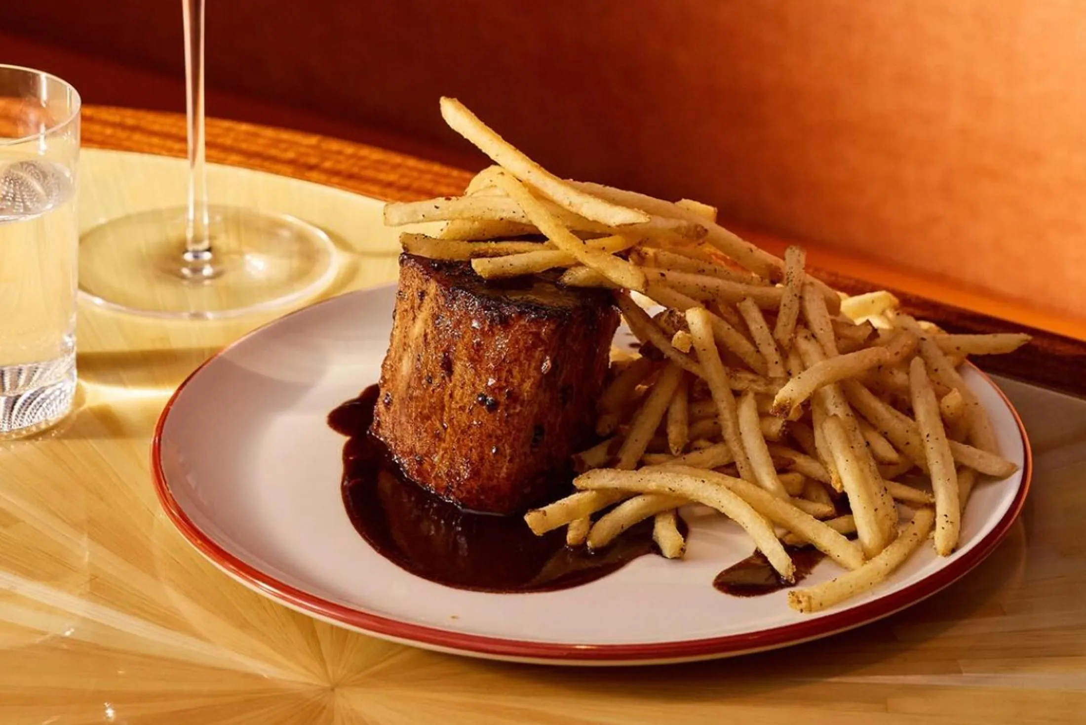 胡椒剑鱼,海獺餐厅亚历克斯·斯图帕克因其精确的墨西哥烹饪而闻名于世,但他也知道如何重新思考经典的美式主菜。在他位于苏荷的曼纳酒店的新海鲜餐厅中,斯图帕克决定使用一块厚达2英寸的肉质剑鱼切块,而不是牛排。它被煎至外脆内嫩,保持多汁和鲜嫩。然后是深褐色的奶油酱,加入了酱油、芥末和牛肉汁,使其更加美味,并用干邑增添甜味,同时加入特利切里和马达加斯加青胡椒粒,带来双重果香的辣味冲击。伴随的薯条,准备好沾那神奇的酱汁,也受益于慷慨的胡椒撒料。