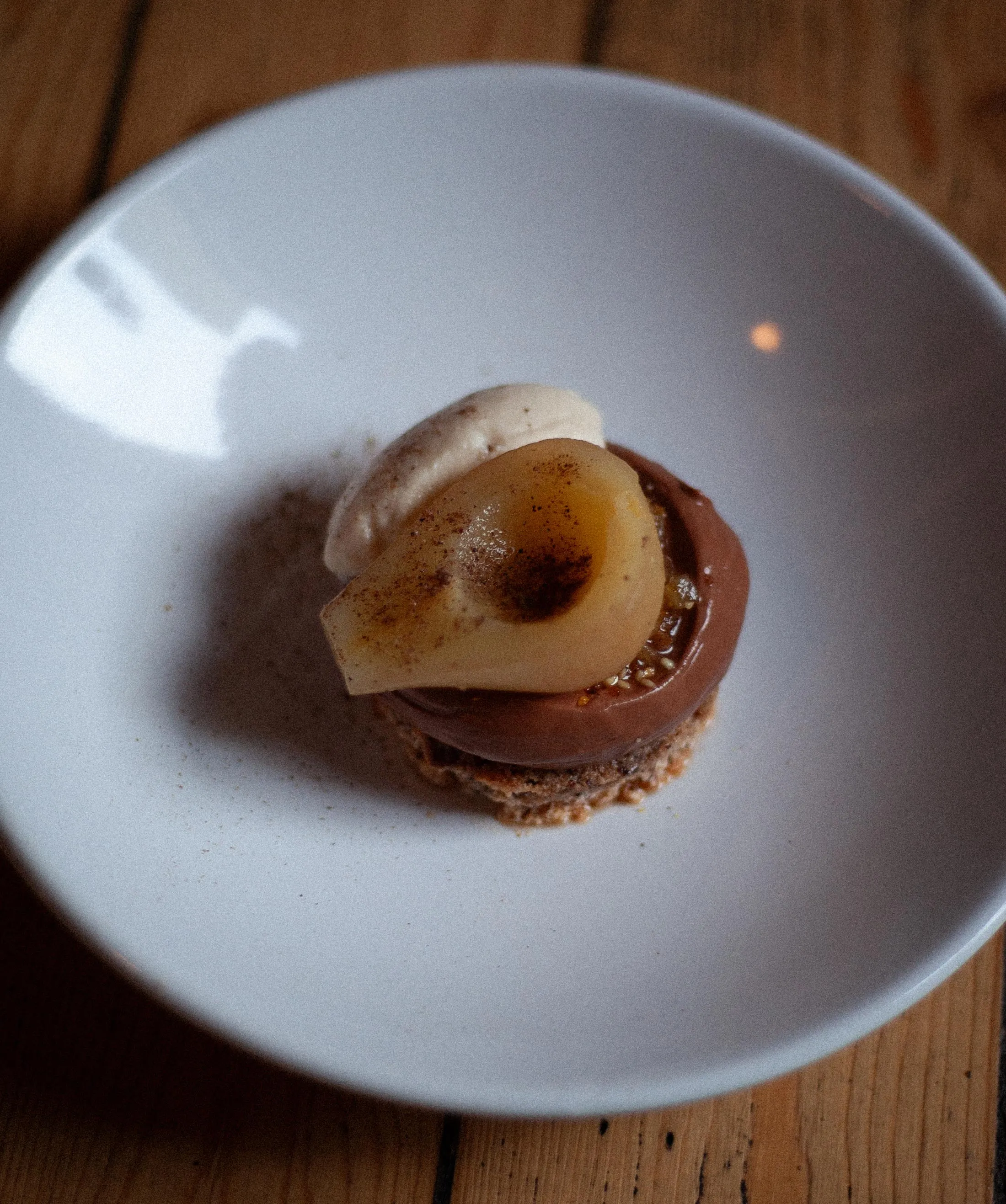 本地风味的裸骨巧克力梨塔。来源:蒙特罗斯裸骨巧克力梨塔, 蒙特罗斯 为您带来优秀的Timberyard餐厅的团队—请参见我2023年最佳菜肴—是这家成立一年的餐厅的幕后团队 这家餐厅位于一座看起来像迷你城堡的建筑中,适合爱丁堡。由厨师吉米·穆雷和莫雷·兰姆制作的五道菜£80($101)菜单的最后一道甜点,像菜单的其他部分一样,突出了当地产品。主角是一种用来自格拉斯哥的裸骨巧克力制作的慕斯,味道明显苦甜。它放在脆脆的榛子蛋白霜上,然后顶部放有半个水煮梨和一勺用马尔萨拉酒和白兰地调味的扎巴戈内。所有这些加在一起,形成了一座小塔,酒精和黑巧克力的奶油感与水果的柔软口感相结合,保持着不过于奢华的平衡。