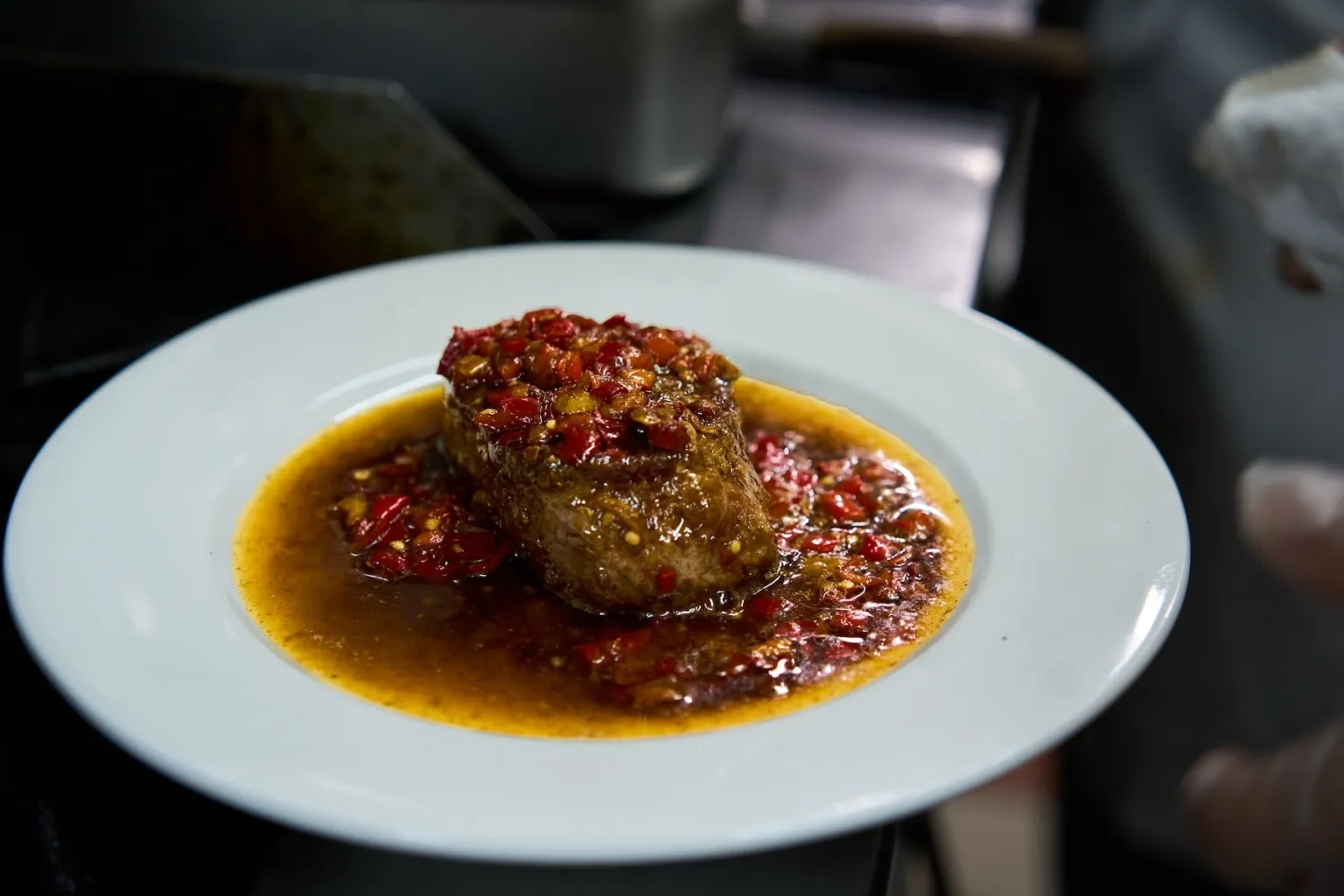 四川菲力牛排,使命中国餐厅风格。摄影师:内森·哈希四川菲力牛排,使命中国餐厅菲力牛排从来不是我首选的肉块。如果我点一块牛排,我希望它是更肉质、更有嚼劲的切块。但我被丹尼·博因在他备受追捧的使命中国餐厅复出时所提供的版本所吸引,现在它在唐人街是一个快闪店。他首先将肉裹上XO面粉并煎炸,使其轻微酥脆,像他在俄克拉荷马城长大时吃的炸鸡牛排。然后他在锅汁中加入大量的青四川辣椒和盐渍辣椒。结果是:每一口超嫩的牛排都有盐渍辣椒的强烈味道和生动的胡椒在你嘴里回荡。
