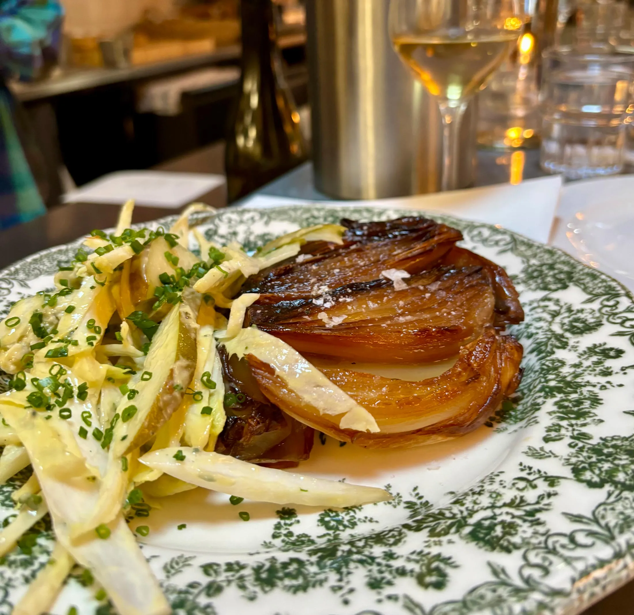 卡米尔华丽的酒友洋葱塔丁。摄影师:凯特·克雷德洋葱塔丁,卡米尔一家认为自己是自然酒吧的法式餐厅,卡米尔是博orough市场引人注目的餐饮场景的关键。每次我去的时候菜单都会变化,但几乎总是有一种天才的咸味版本的传统法式苹果甜点。埃利奥特·哈什特鲁迪在泡芙面团的圆片中嵌入焦糖洋葱,撒上茴香种子和一层糖,然后烘烤,使咸味的酥皮呈金黄色,松脆柔嫩,带有来自烤香料的惊艳甘草味。旁边有一份轮换的沙拉;如果你幸运的话,你会得到与酸味相得益彰的刺鼻的芥末菊苣叶。