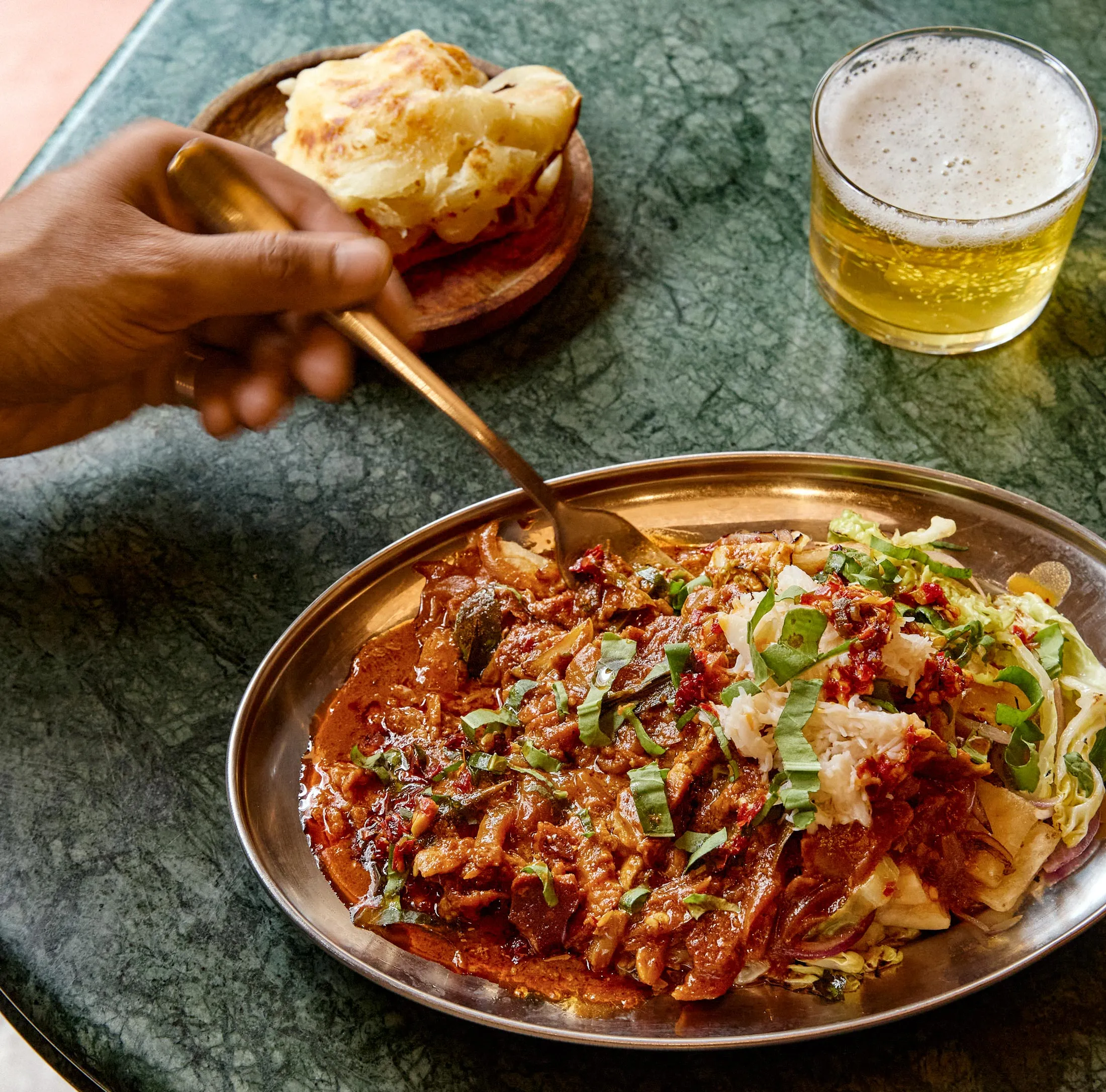 Rambutan的惊艳炒饼配褐色蟹咖喱。来源:Rambutan炒饼配褐色蟹咖喱,Rambutan“炒饼可能是斯里兰卡街头食品中最受欢迎的菜肴,”Cynthia Shanmugalingam在她的Borough Market餐厅中宣称,这里提供南亚岛屿的美食。她将她祖母的食谱与美味的多塞特褐色蟹结合,制作出一种多层次的奶油蟹咖喱;它重奶椰,加入了火辣的贾夫纳咖喱粉。她还加入了咖喱叶、卷心菜和大块令人上瘾的炒饼,饼被幸福地浸泡;热蒜蓉黄油为这道菜画上了句号,使其成为一件多层次、高香料的杰作。