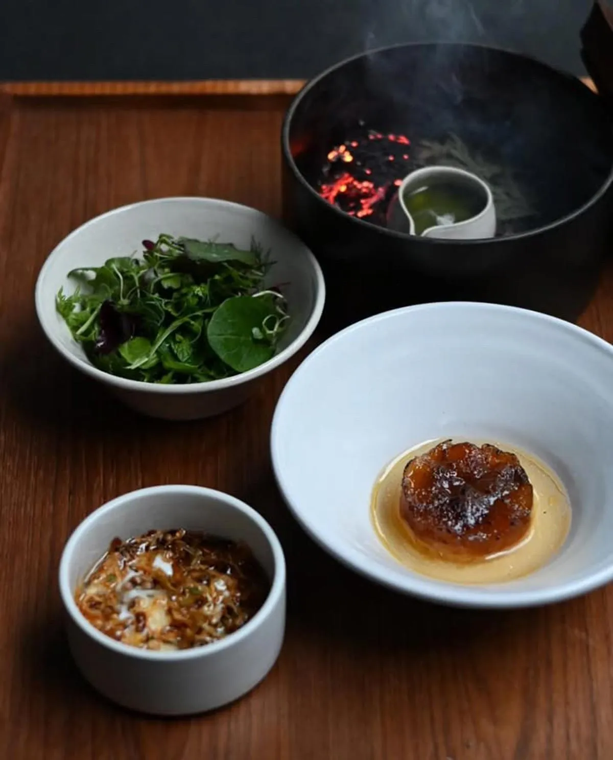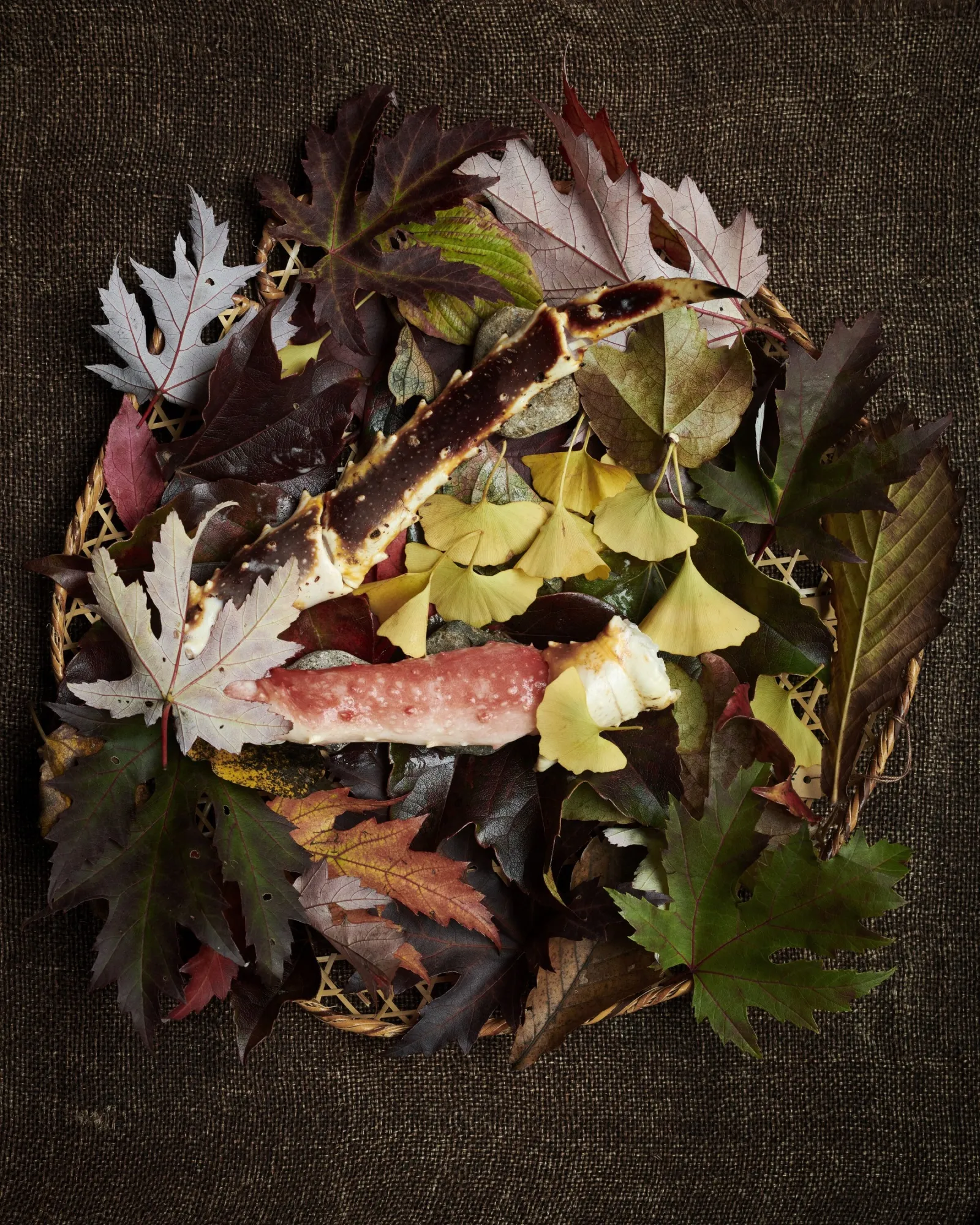 蒸蟹藏在Noma Kyoto的秋叶下。摄影师:Ditte Isager蒸蟹,Noma Kyoto当 René Redzepi 宣布他的著名丹麦餐厅 Noma将在秋季于京都进行为期10周的驻店时,他承诺会有螃蟹。这是840欧元(881美元)15道菜的餐点的开端——尽管你必须挖掘一盒五彩斑斓的秋叶才能找到它。(厨师说他的哥本哈根团队在到达时干燥了10,000片叶子。)巨大的北海道帝王蟹腿经过烤制和水煮,但首先它在一种混合物中腌制,这种混合物包含了用于酿造清酒的麹米,能够使肉质变嫩,同时突显甜味。在旁边的小碗中是餐厅的“软糖”,这是Noma菜单上的常见菜品:一种深棕色的混合物,由味噌、黄油和干玫瑰花瓣制成,具有强烈、深甜和花香的鲜味。为了保持冒险的主题,没有餐具;相反,你用手吃螃蟹,在用小花刷将其装饰上软糖后。