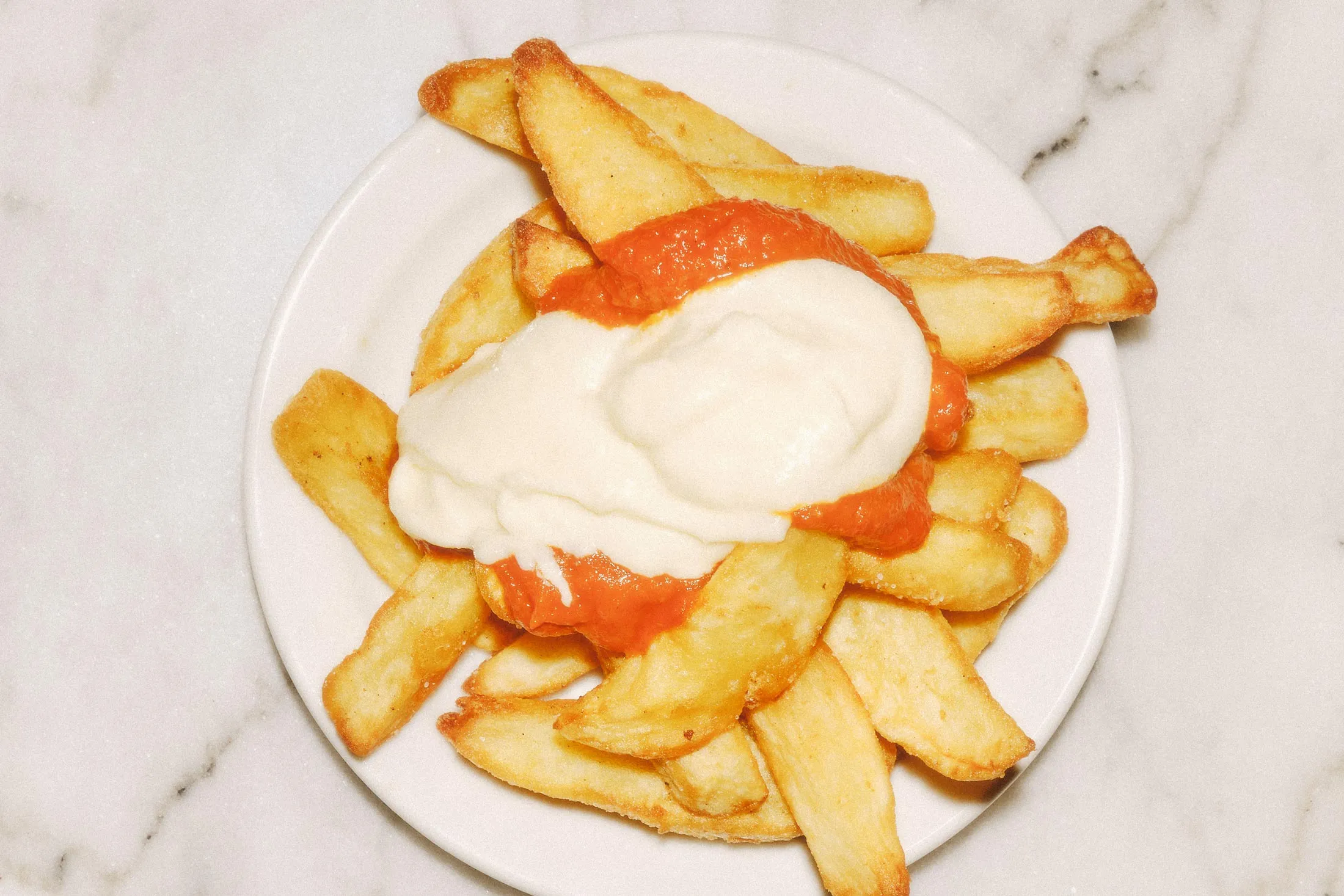 塔帕斯餐厅Tollingtons的特色是布拉瓦薯条。来源:Tollingtons布拉瓦薯条,Tollingtons这家位于北伦敦的时尚塔帕斯餐厅仍然感觉像它曾经的炸鱼和薯条店。这种感觉延续到厨师埃德·麦基尔罗伊的布拉瓦薯条。他对经典西班牙菜肴的惊人改良版本采用了适当厚实的土豆,用牛脂炸制,因此几乎有肉感。它们慷慨地淋上了浓烈的大蒜味蒜泥蛋黄酱和一种香料番茄酱,麦基尔罗伊将其减少到底部焦黑,为菜肴增添了引人注目的烟熏风味。