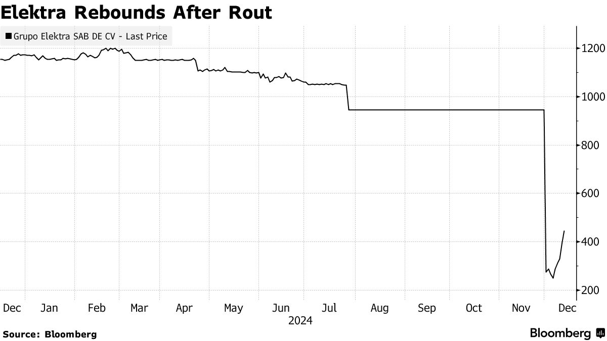 在Elektra于12月6日开始回购股票后,该股削减了上周的损失,并与大股东达成交易。由黑石集团和先锋集团等公司管理的指数跟踪基金在Elektra于7月暂停交易后被移出墨西哥基准股票指数后,正寻求出售该股票。