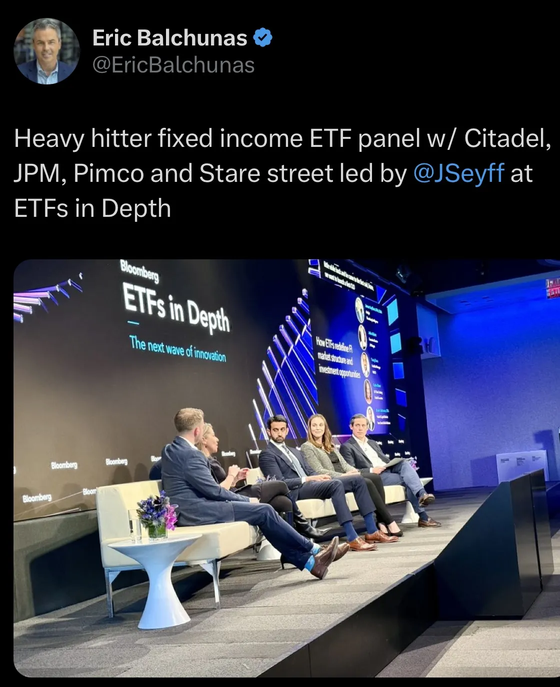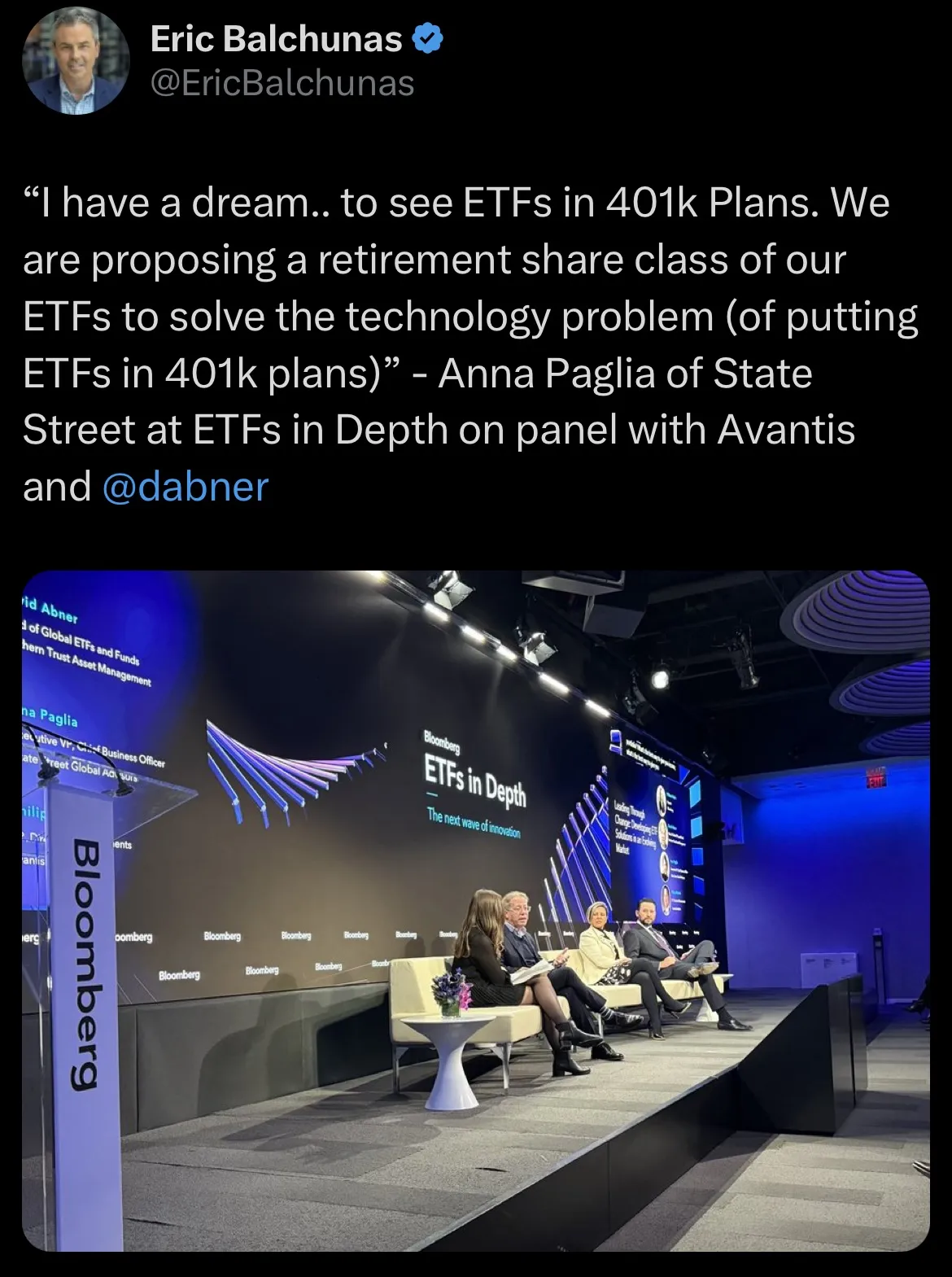 彭博社的维尔达娜·哈吉里克主持了与北方信托资产管理公司的大卫·阿布纳、Avantis董事的菲利普·麦金尼斯和州街全球顾问公司的安娜·帕利亚的对话。帕利亚自称的一个痴迷是将ETF融入美国退休系统。正如我们之前在这份通讯中讨论过的,401(k)是ETF的最后边界——它们是围绕共同基金构建的, incumbency bias非常强。
