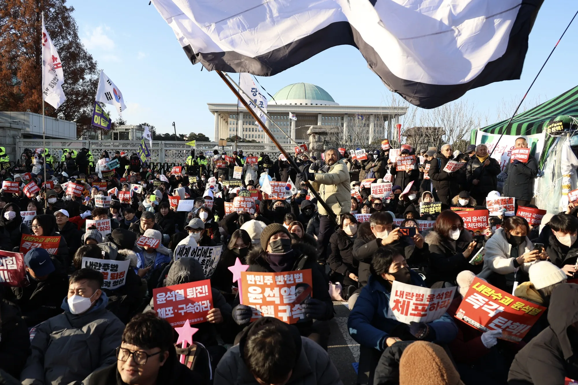 示威者在国会外抗议,针对韩国总统尹锡悦的第二次弹劾动议,时间为12月14日,地点在首尔。