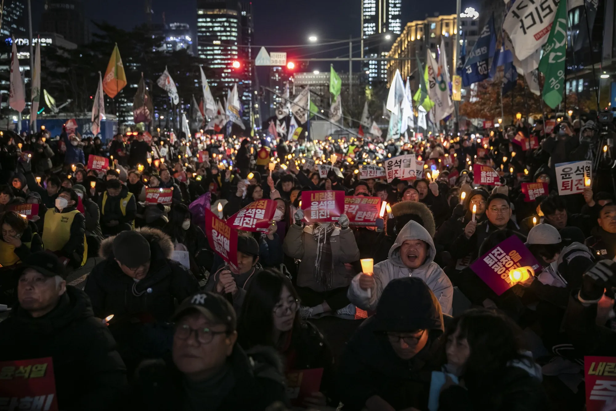 抗议者在12月6日于首尔国会大楼外的烛光示威中呼吁尹总统辞职。摄影师:Woohae Cho/Bloomberg不过,情况有些复杂。