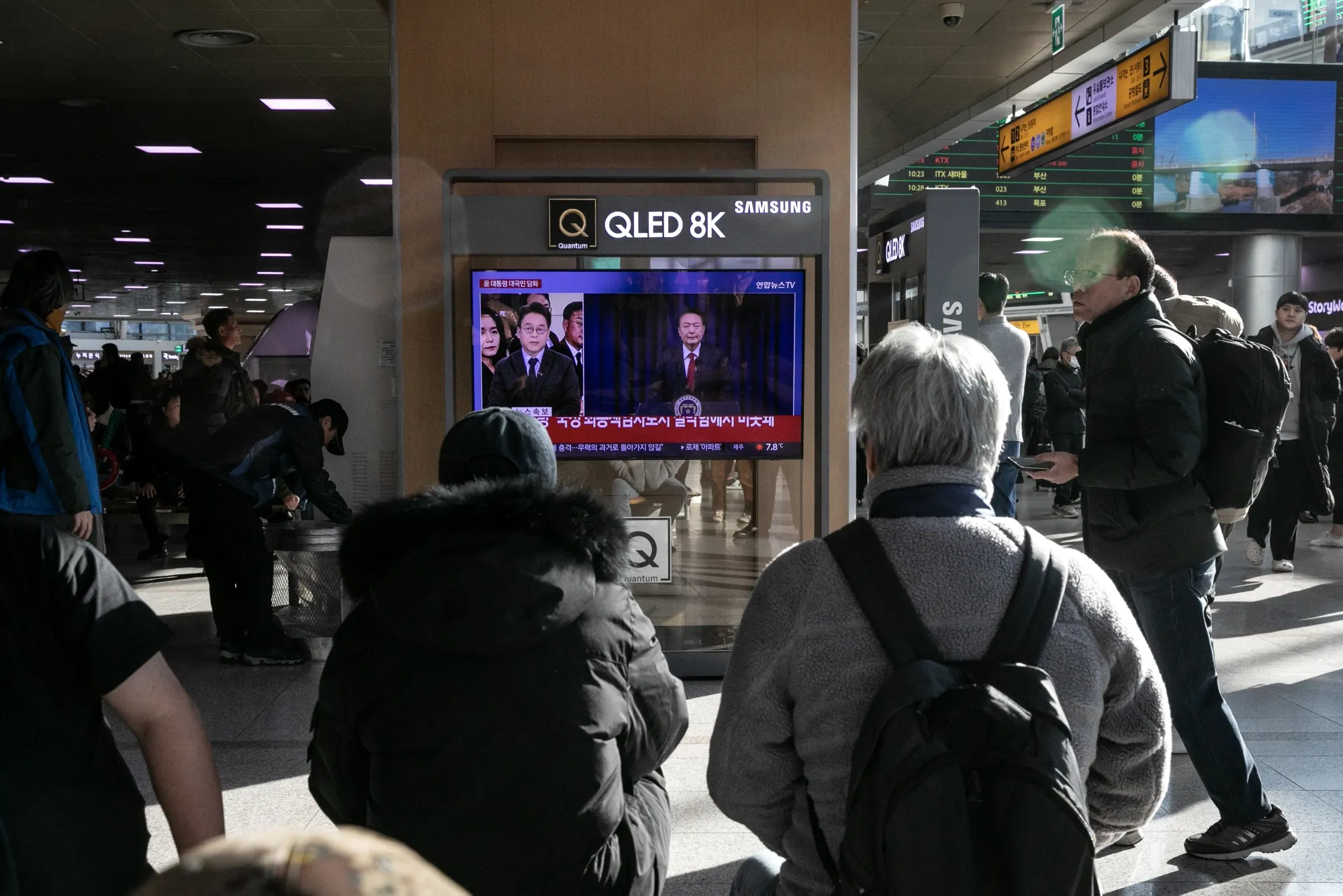电视屏幕显示了尹总统在12月7日于首尔站发表演讲的画面。摄影师:Woohae Cho/Bloomberg### 韩国总统曾被弹劾过吗?