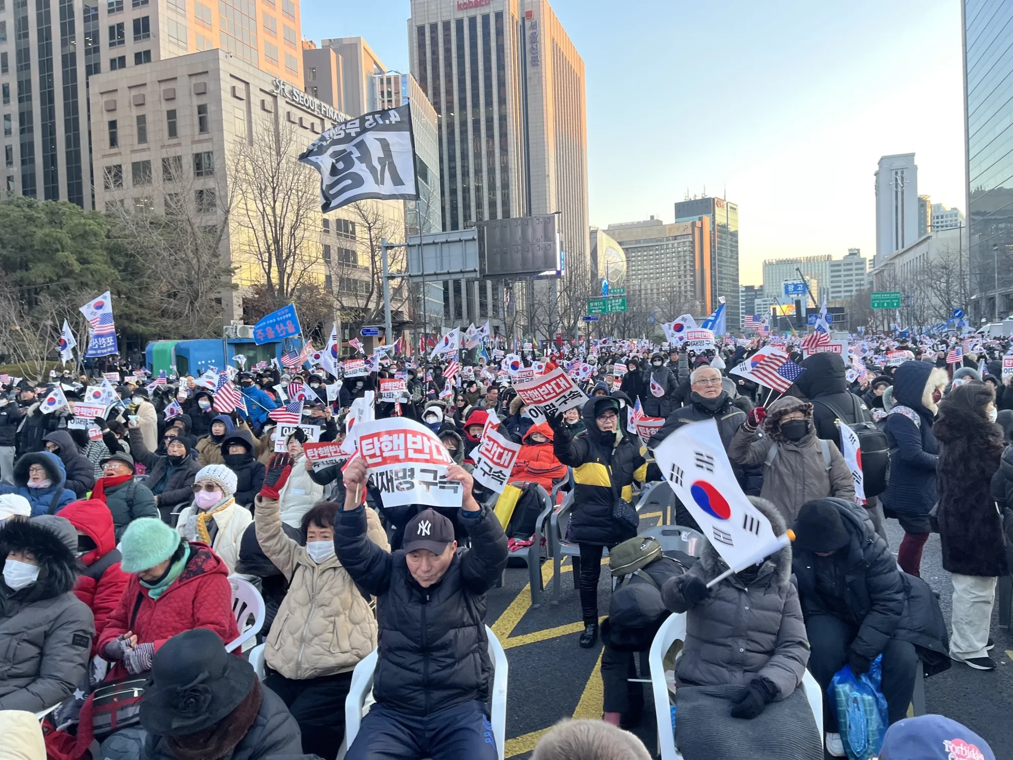 周六对韩国来说是个重要的日子,在首尔,过去几周有成千上万的人聚集在一起表达对尹的愤怒或支持。