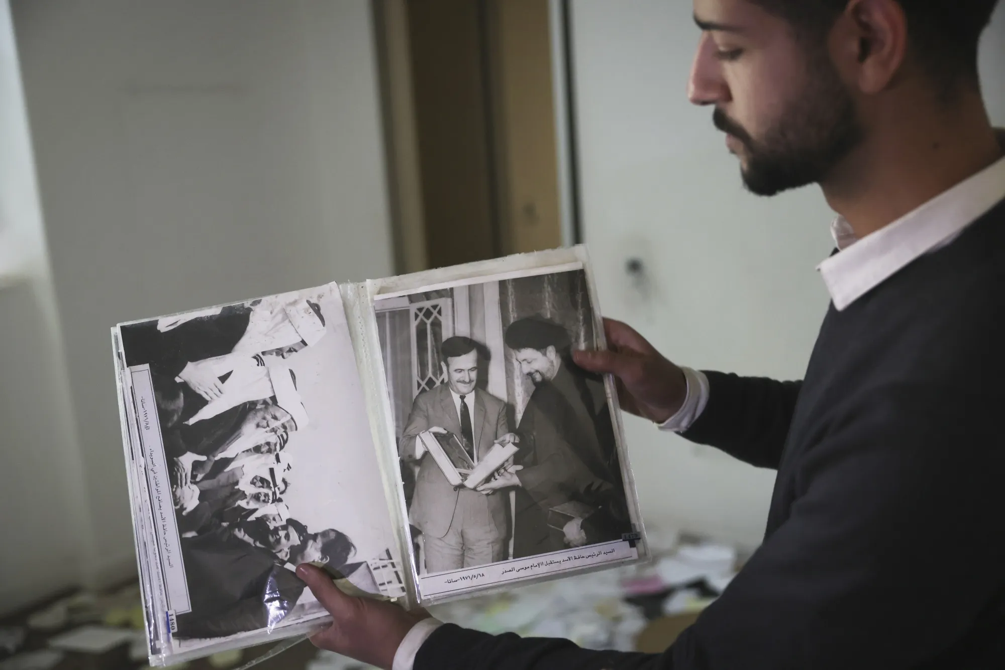 一名男子展示已故叙利亚总统哈菲兹·阿萨德的旧照片,人们在大马士革的巴沙尔·阿萨德被洗劫的住所中寻找物品。