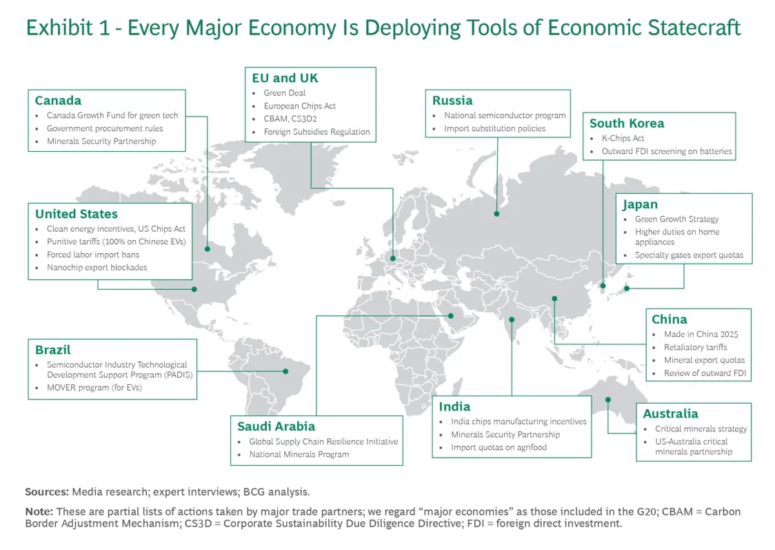来源:波士顿咨询集团根据波士顿咨询集团10月29日的报告,现在每个主要经济体都在使用经济国家手段的工具,部署关税、投资限制、出口配额和补贴,以利用他们在地缘政治竞争加剧时代的独特优势。