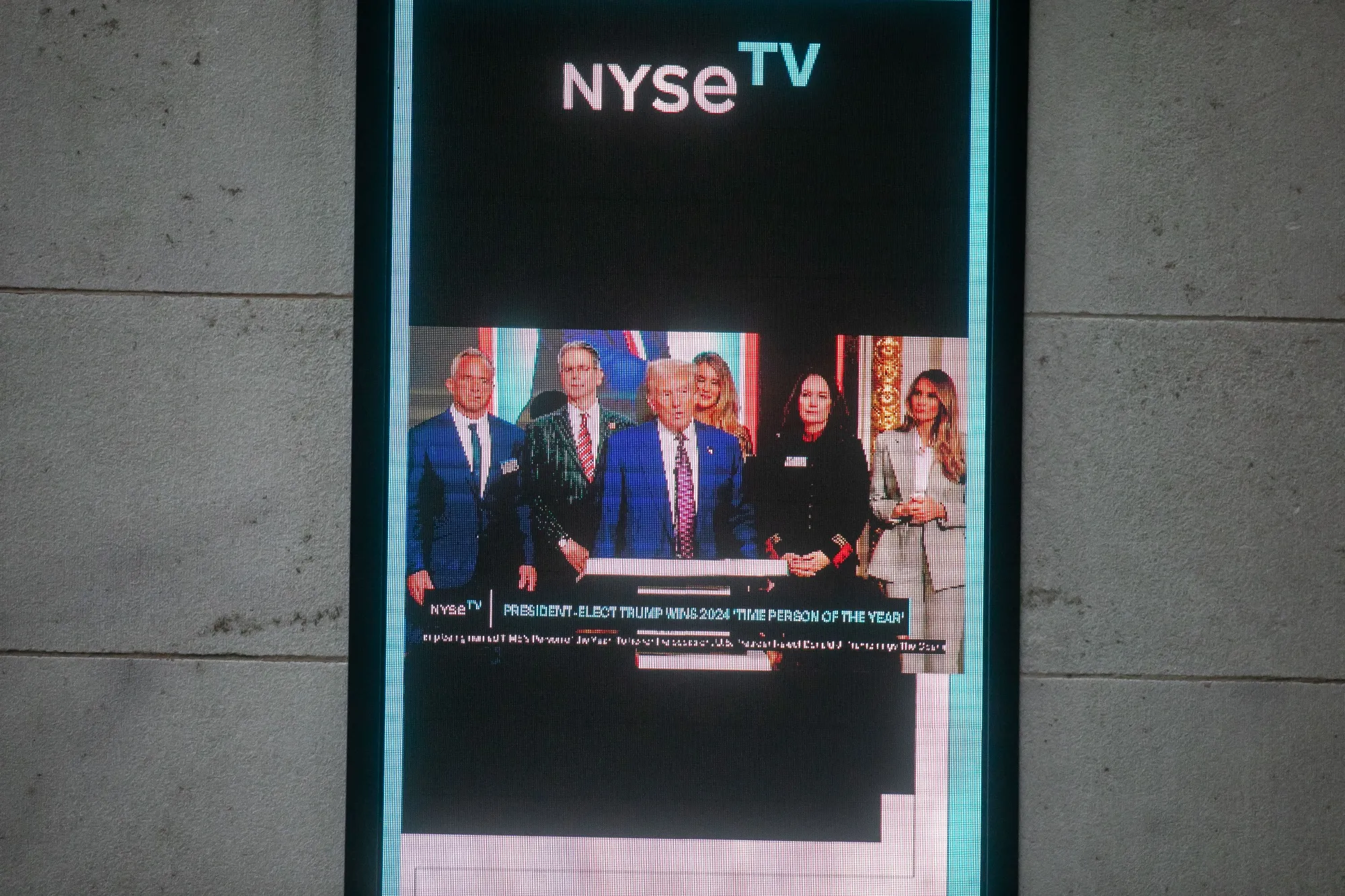 一台显示器展示了唐纳德·特朗普在纽约证券交易所外的图像。