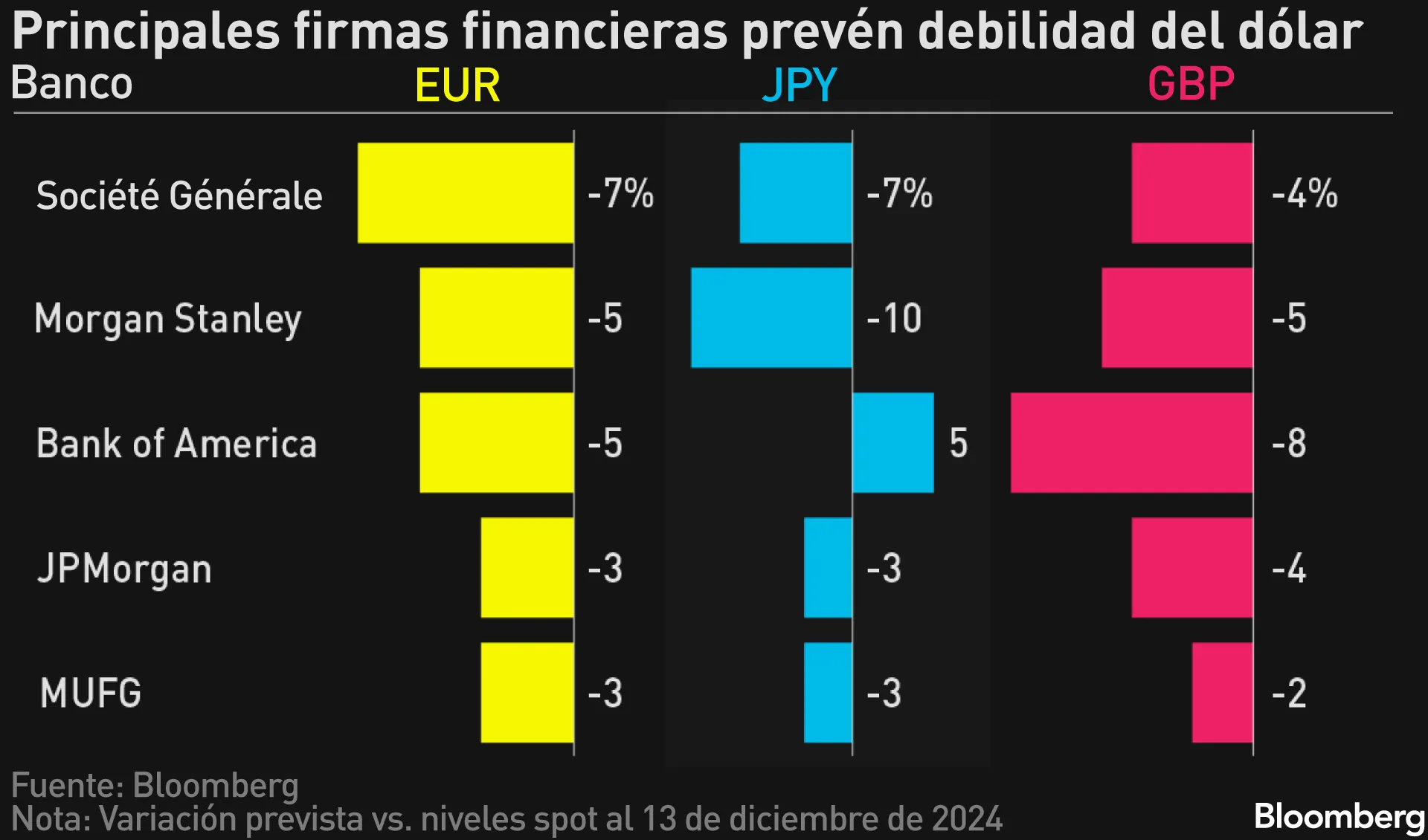 在 富国银行,策略师们认为全球各大央行的相对政策将支持美元,而不是削弱它。他们预计到2025年,美元将对十国集团的其他货币升值5%到6%,在一份年末客户报告中写道。