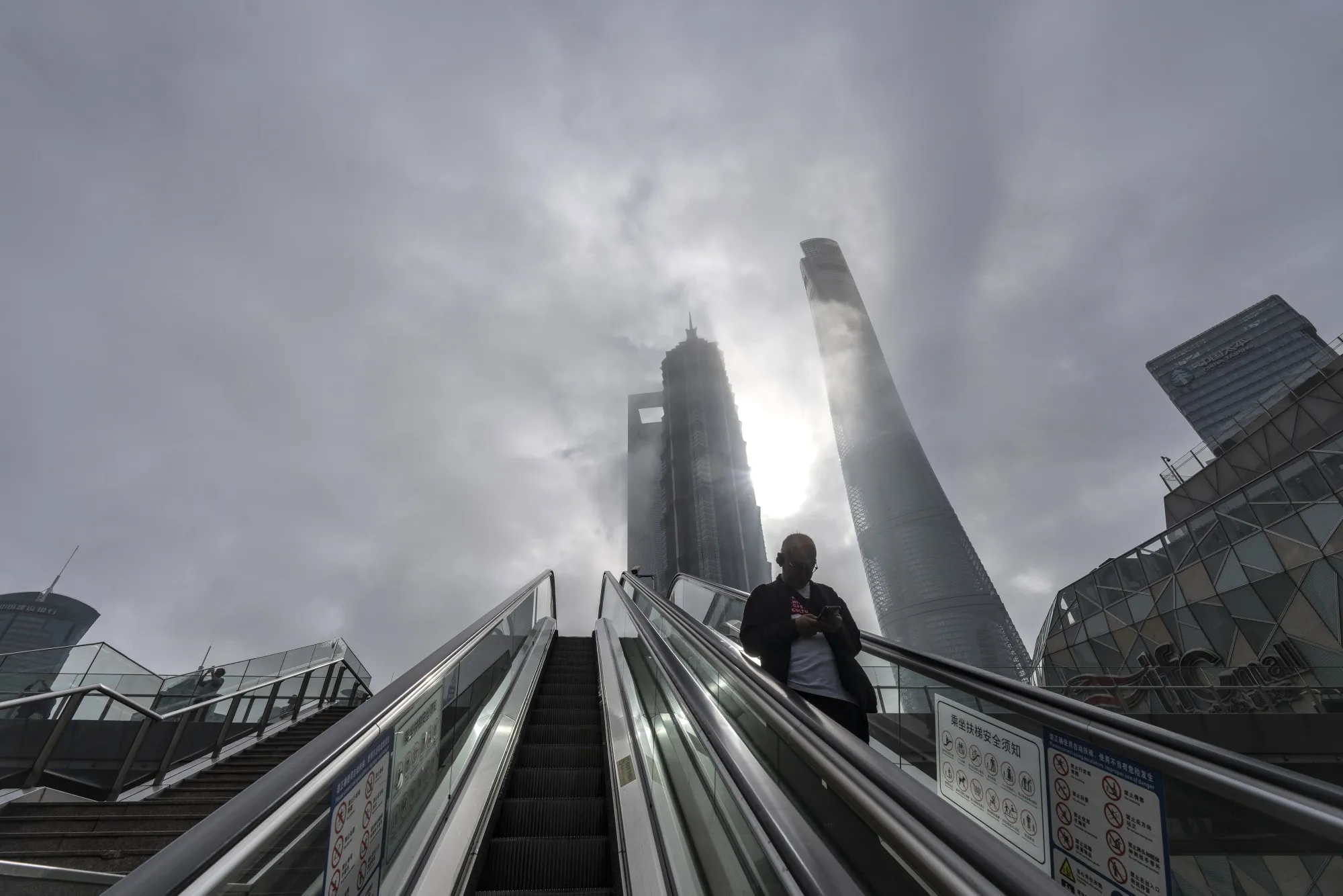 一名行人在中国上海浦东陆家嘴金融区乘坐自动扶梯。